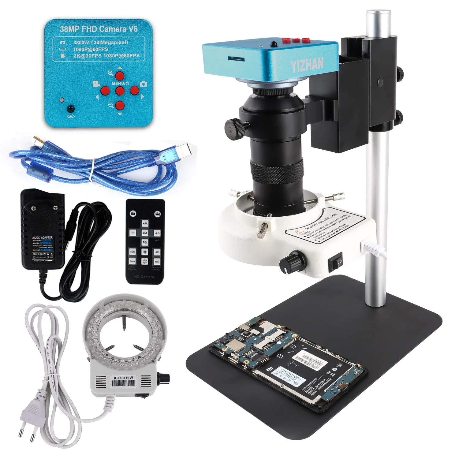 1*38 Мп HDMI-совместимая камера1 * Светодиодный кольцевой светильник1 * подставка для микроскопа1*130x Регулируемый объектив1 * HDMI-совместимая линия передачи1 * пульт дистанционного управления * 11 * источник питания1 * Руководство пользователя на английском языке