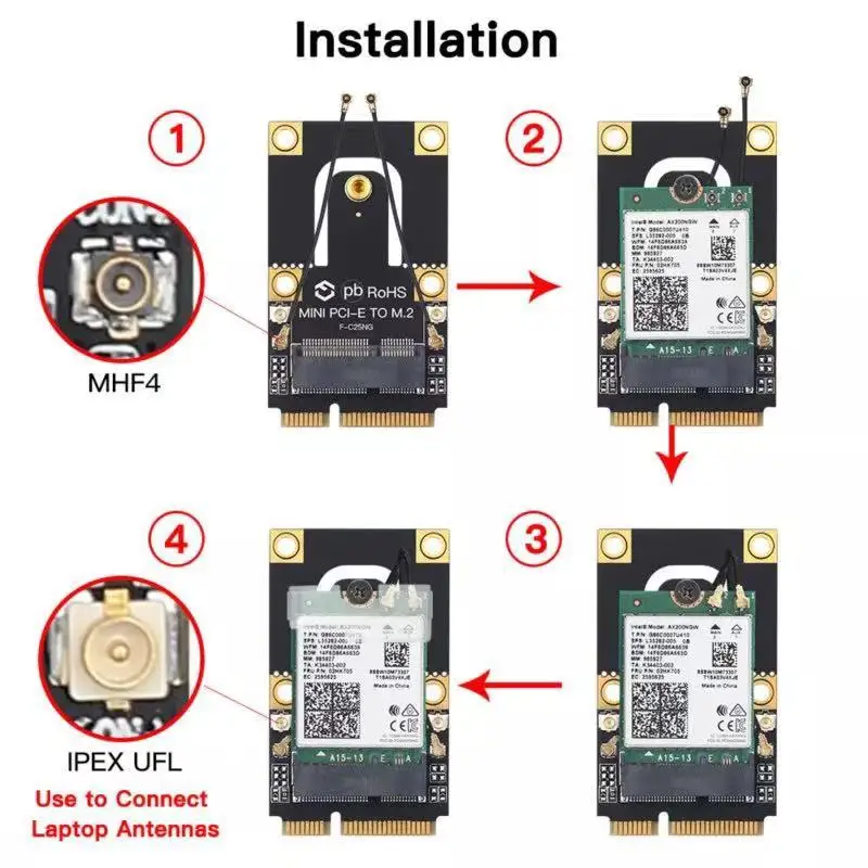Используйте M.2 ключ E в мини конвертер PCI-E Простая установка Wifi карты, M.2 Wifi карты в полный размер PCI-E.M.2 Wifi карта до половины размера мини PCI-e беспроводная карта, она может заменить старый мини PCI-E Wifi карта в вашем lasptop.