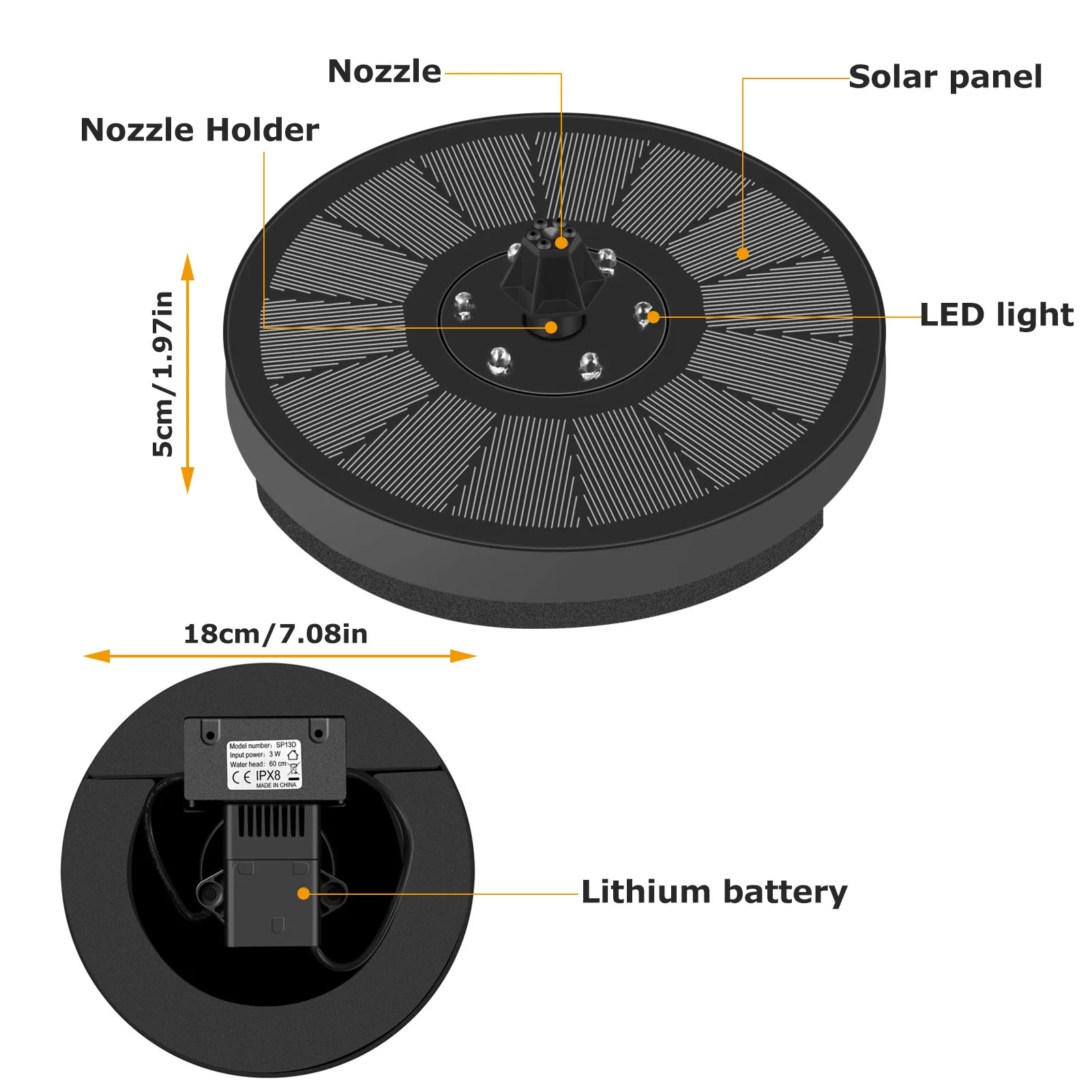Размер: диаметр: около 160 мм/6,30 дюймаВес нетто: около 280 гСолнечная панель: поликристаллический ПЭТ ламинированный для солнечной панелиМаксимальная мощность: 3 ВтМаксимальная высота распыления: 30-60 смСолнечная панель: 7 в/3 ВтНасос Выход: DC 4,5-12VМаксимальный поток: 180 л/чБатарея Емкость: 3,7 V/900mAhХарактеристики: водяной насос имеет защиту от нехватки воды и антиблокирующую функцию, которая эффективно продлевает срок службы насоса.