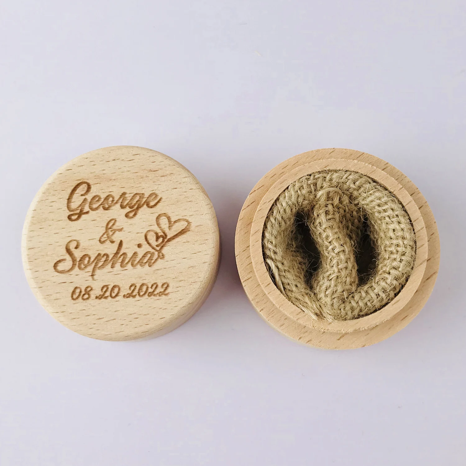 Деревянная коробка для свадебных колец с именами и датой на заказ, индивидуальная круглая коробка для кольца с гравировкой, сувенирный подарок для пары