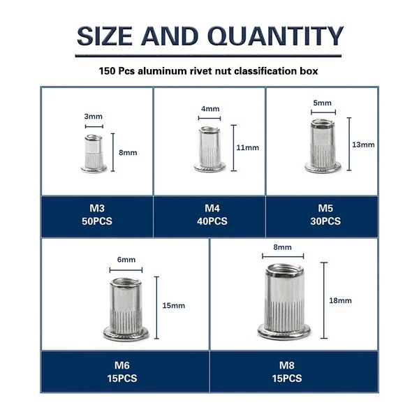 Набор гаек для заклепок M3M4M5M6M8, 150 шт.