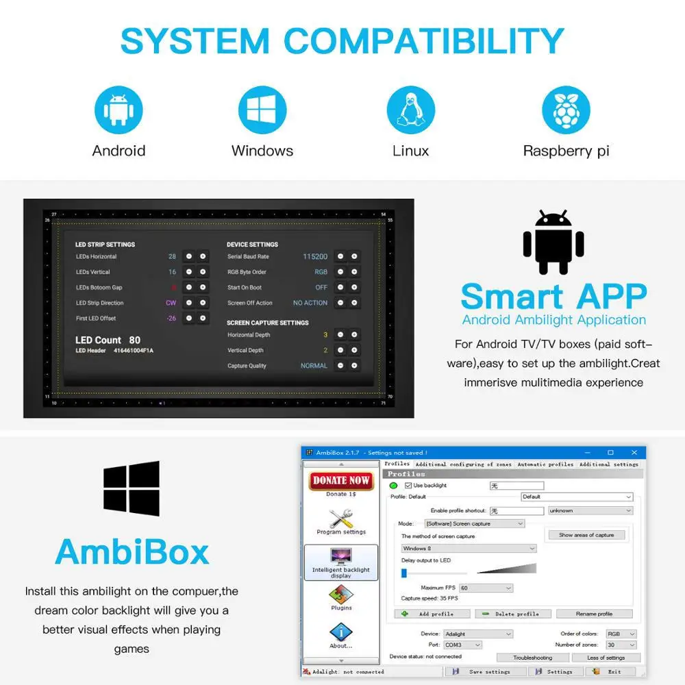Примечание:Он работает только на Android TV, Samsung/LG не является частью операционной системы Android.Если вы хотите использовать его с Samsung/LG TV, вы должны сначала подключить дополнительный Android TV box к телевизору, прежде чем вы сможете использовать его с нашими продуктами.Какое программное обеспечение необходимо?Окна: Ambibox или PrismatikRaspberry Pi: Openelec / libreelec + Hyperion (https://youtu.be/r1Cbg8LLzEs)Android TV/TV Box (Android 5,1 или выше): приложение Android (Платное программное обеспечение)(Или, Видеосигнал компьютера выводится на телевизор, а телевизор выступает в качестве монитора.)(Или установите или запустите Openelec/libreelec + Hyperion на TV/TV box.)Самое главное, что нужно знать!Уровень телевизора Android не обрабатывает аналоговые ТВ-сигналы, поэтому приложение подсветки не подходит для обычных ТВ-каналов. Подсветка доступна только для приложений ОС Android, которые не используют защищенное содержимое. 4K производительность зависит только от вашего оборудования.К сожалению, такие программы, как YouTube и Netflix, используют защищенное содержимое (DRM) и приложения не могут их использовать. Для того, чтобы сделать его работать, вы должны использовать специального клиента. Например, SmartYoutube.Посылка:1. Блок контроллера Yinice2. Высококачественный светодиодный светильник3.USB кабель4. Адаптер питания DC5V, с вилкой EU/US/UK/AU.Примечание:Так как Настройка этого проекта немного сложная, если продукт не работает должным образом, пожалуйста, сначала свяжитесь с нами, вместо общественных споров или прямых отрицательных отзывы, У нас есть профессиональная команда, которая поможет вам решить проблему. Спасибо!