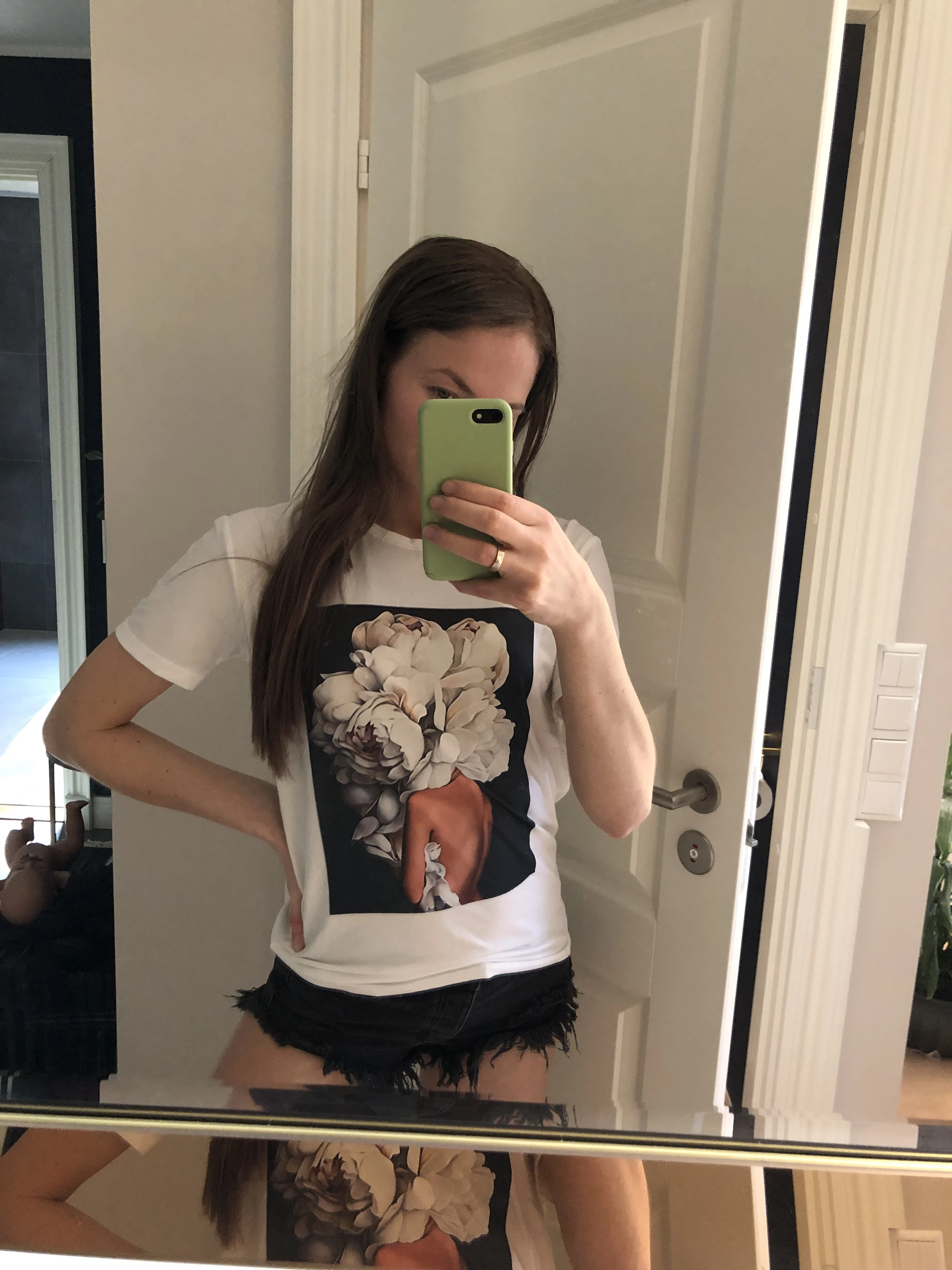 Майка пришла в хорошем состоянии и качестве. Только на картинке майка выглядит, как оверсайз, на самом деле она приталенная и рукова на картинке длиннее, чем в живую.