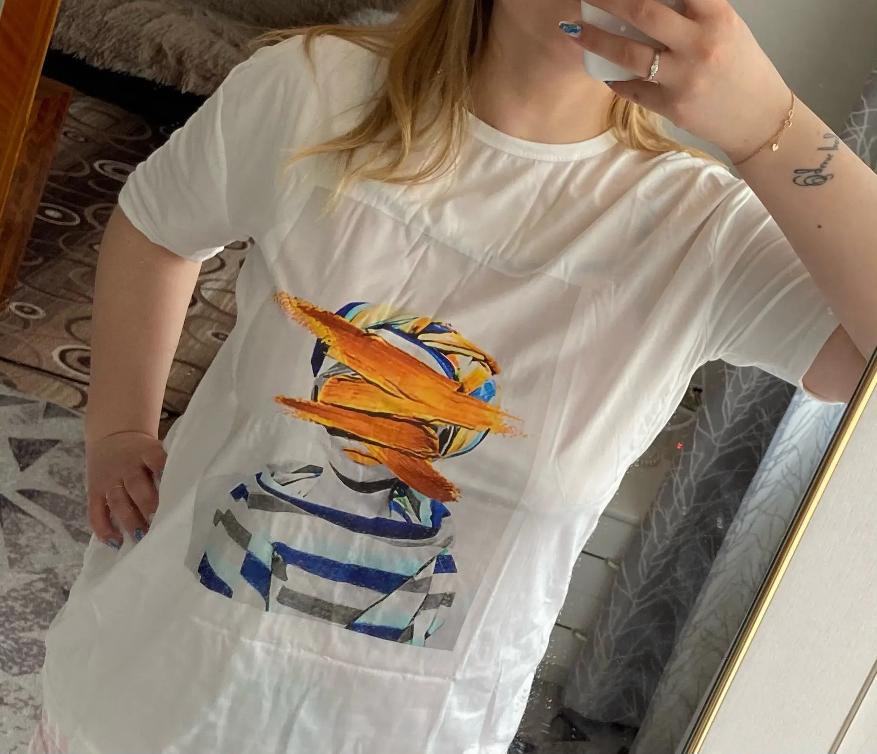 Убираю звезду за то, что состав ткани не хлопок, как было заявлено, а 100% синтетика, хоть это и качественная синтетика. Принт не "просиликоненный" а, как бы, пропечатанный, четкий. По размеру я взяла М на ог 92,от 70,об 94, нормально, но я бы хотела еще более свободно. Пришла посылка в Беларусь за 3 недели, отправил прадавец посылку быстро.