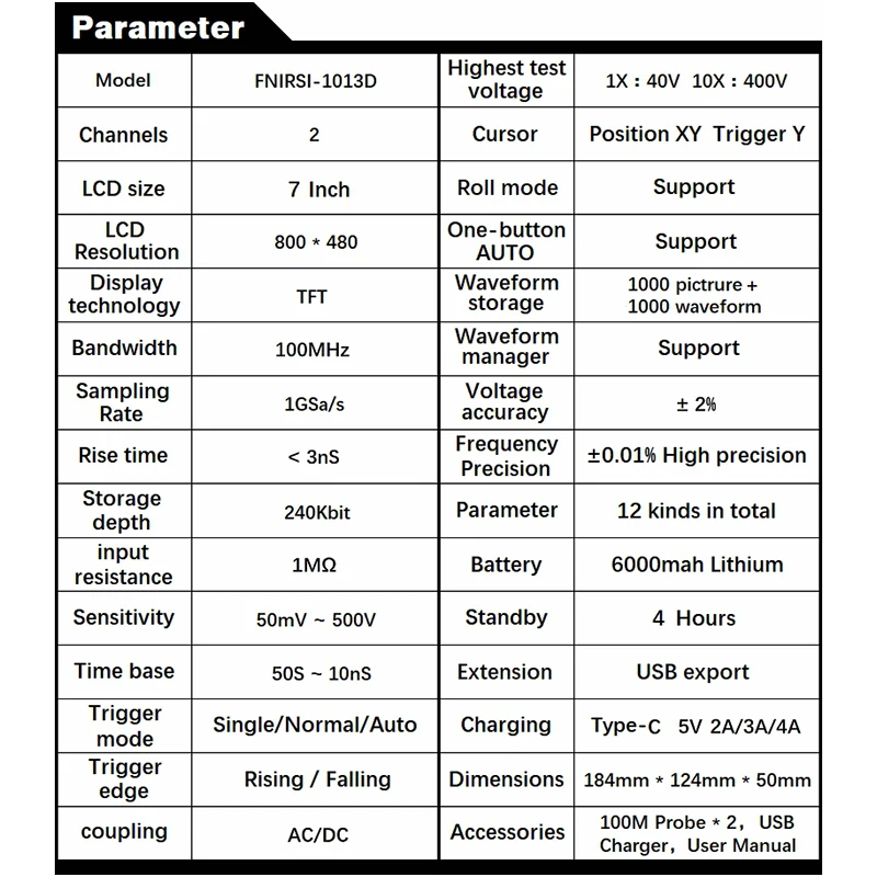 Для FNIRSI-1013D двухканального осциллографа 100 МГц 1 ГГц/с 7-дюймовым цветным ЖК-дисплеем с сенсорным экраномОписание продукта:FNIRSI-1013D-полнофункциональный, очень практичный, экономичный двухканальный плоский осциллограф для технического обслуживания и НИОКР. Этот осциллограф имеет частоту дискретизации в реальном времени 1 ГГц/с и аналоговую полосу пропускания 100 МГц * 2. Благодаря полной функции запуска (одиночный/Обычный/автоматический) его можно свободно использовать для периодических аналоговых или непериодических цифровых сигналов; встроенный модуль защиты от высокого напряжения выдерживает Непрерывное напряжение до 400 В. Авария с выгоранием осциллографа, вызванная поворотом датчика в положение 10X. Режим Прокрутки с большой базой времени может отслеживать медленные изменения уровня; Оснащен высокоэффективным автоматическим управлением с одной кнопкой, который может отображать измеренную форму волны без утомительных настроек; дисплей оснащен 7-дюймовым ЖК-экраном высокой четкости с разрешением 800*480, а методом работы является работа с сенсорным экраном конденсатора и жестом, чрезвычайно удобная; Функция измерения курсора, Вам не нужно считывать единицы и количество фоновой шкалы при ручном чтении параметров амплитуды и частоты, и вы можете напрямую Получить пик, пик и частоту без преобразования; чрезвычайно удобный снимок экрана и функция хранения сигналов, встроенное место для хранения 1 Гб, Может хранить до 1000 скриншотов + 1000 наборов данных формы волн, процесс хранения прост и быстрый, сохраняет текущую форму волн в любое время и в любом месте одним касанием, без громоздких подсказок и выбора, сохраняйте спокойствие, текущие данные сохраняются на месте, что очень удобно; Мощный диспетчер изображений формы волн поддерживает просмотр миниатюр, просмотр, Детальный просмотр, поворот страниц, удаление и масштабирование волн, уменьшение, перемещение и т. д. для облегчения вторичного анализа. Фюзеляж оснащен интерфейсом USB, который можно подключить к компьютеру для совместного использования скриншотов с компьютером, что удобно для вторичного анализа; функция графического отображения цифр Lissajous может использоваться для определения амплитуды, частоты и фазового контраста двух групп сигналов; Анализ гармонических компонентов сигнала; Встроенный высококачественный литиевый аккумулятор емкостью 6000 мАч, который может работать 4 часа на полном заряде и может использоваться во время зарядки как ноутбук.Особенности:1. Умный анти-ожог, 1X выдерживает до 400 В, Выдерживает напряжение2. Аналоговая полоса пропускания 100 МГц при частоте дискретизации 1 ГСА/с (1x = 5 МГц, 10x = 100 МГц)3. Полностью подходит для 7-дюймового цветного TFT ЖК-дисплея с разрешением 800*480, яркими цветами и высокой контрастностью4. Емкостный сенсорный экран, такой же, как и Сенсорный режим современного мобильного телефона для iPad, не является резистивным сенсорным экраном с древней работой ногтей5. Диапазон высокого измерения напряжения, 1x может измерять 0 ~ 40 В, 10x может измерять 0 ~ 400 В, 100x может измерять 0 ~ 4000 в6. Измерение до 12 параметров: VPP, VP, Vmax, Vmin, Vavg, Vrms, частое, долг +, долг-, время +, время-, период7. Функция измерения курсора, удобно вручную измерять период, частоту и напряжение8. Функция полного запуска (одиночный, нормальный, автоматический)9. В любое время отображение 