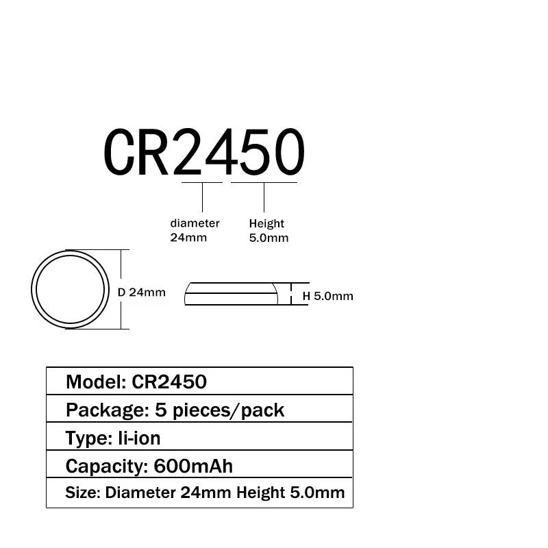 Особенности: 100% Новинка! Обеспечивает отличную непрерывную мощность. Высокая плотность энергии, длительный срок службы. Может использоваться с игрушками, калькуляторами, лазерными указателями, калькуляторами, камерами, часами, часами, компьютерами, играми, цифровыми камерами, видеокамерами, КПК, пультами дистанционного управления, электронными инструментами, mp3-плеерами, цифровыми дикторами, измеритель уровня глюкозы в крови, измеритель уровня холестерина, светодиодный индикатор и другие электронные приборы. Также известный как: DL2450, BR2450, LM2450, 5029LC, KCR2450 Характеристики: Литиевая батарея CR2450 (одиночное использование) Напряжение: 3 в Диаметр: 24*5,0 мм Внимание: Храните аккумуляторы в сухом и прохладном месте. Не перезаряжать и не избавляться от огня. Вставьте батарею в правильном направлении и избегайте короткого замыкания. Посылка включает в себя: