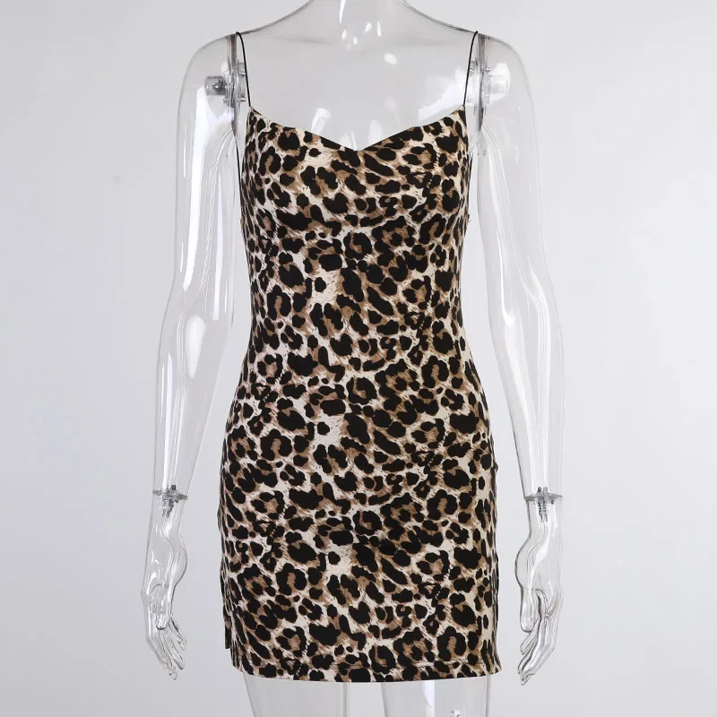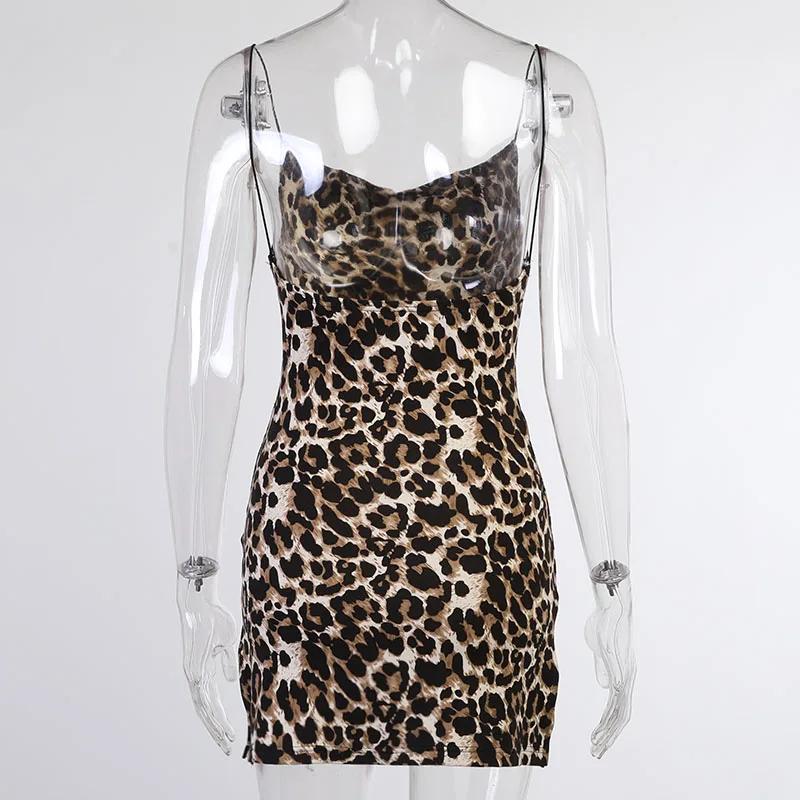 Женский леопардовый сарафан на бретелях-спагетти, сексуальный мини-сарафан с открытой спиной, летнее модное платье на бретелях с разрезом вечерние клубная одежда