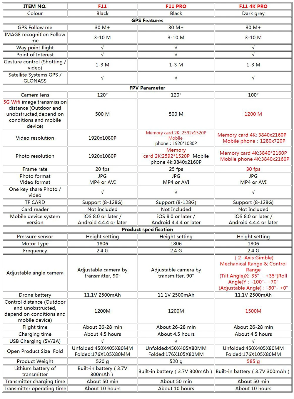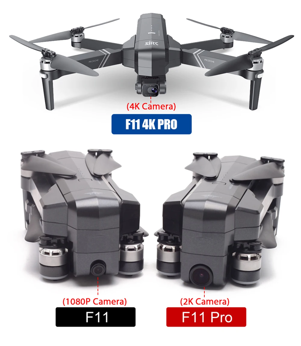 F11 Pro (4K) самое последнее F11 версия, с 2-гидростабилизатору и 4K пикселей. Предыдущая версия 1080P и 2K версии без карданного шарнира. Схема различия выглядит следующим образом, друзья, пожалуйста, тщательно различают, чтобы предотвратить покупку из-за недостаточного понимания неправильного дрона