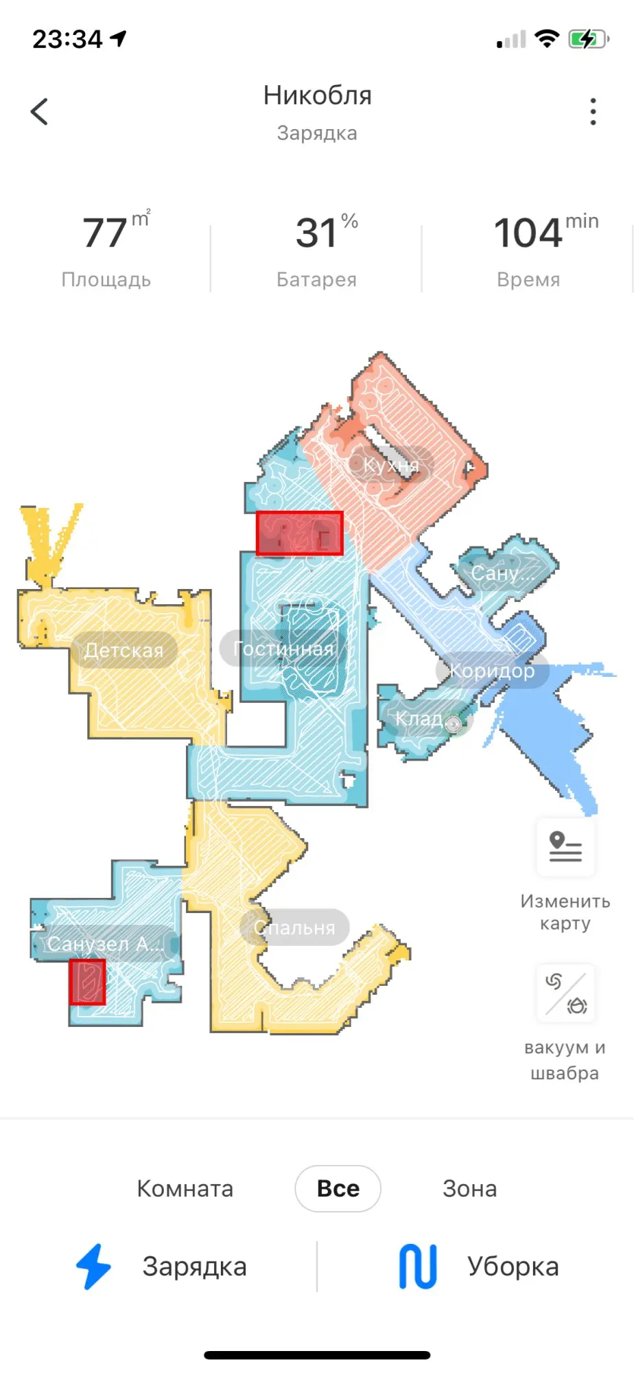 Нареканий к пылесосу нет. Моет, пылесосит. Всё супер, есть с чем сравнить. Карту строит удовлетворительно. Шумновата боковая щетка, но где вы видели бесшумный пылесос? Боковая щетка при работе только в режиме полотёр всё равно работает. Ковры распознаёт корректно. У меня квартира 120кв, мало мебелирована, площадь уборки 77квадратов. Заряда аккумулятора хватило с запасом, время уборки 104 минуты. Уже устала ждать, когда уберётся. Но это первая уборка, следующие будут быстрее. Русского языка нет, украинский есть. Инструкции на русском так же нет. Но аппарат простой и понятный. Инструкция хорошо иллюстрирована. Продавец очень долго отправлял товар (больше недели). Создал накладную на отправку после того, как написала ему о своей озабоченности этой проблемой. Доставка была через 5post. Сама ТК доставила уже быстро. Коробка была немного замята, но не критично, внутри всё целое.