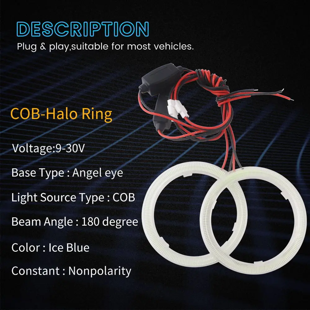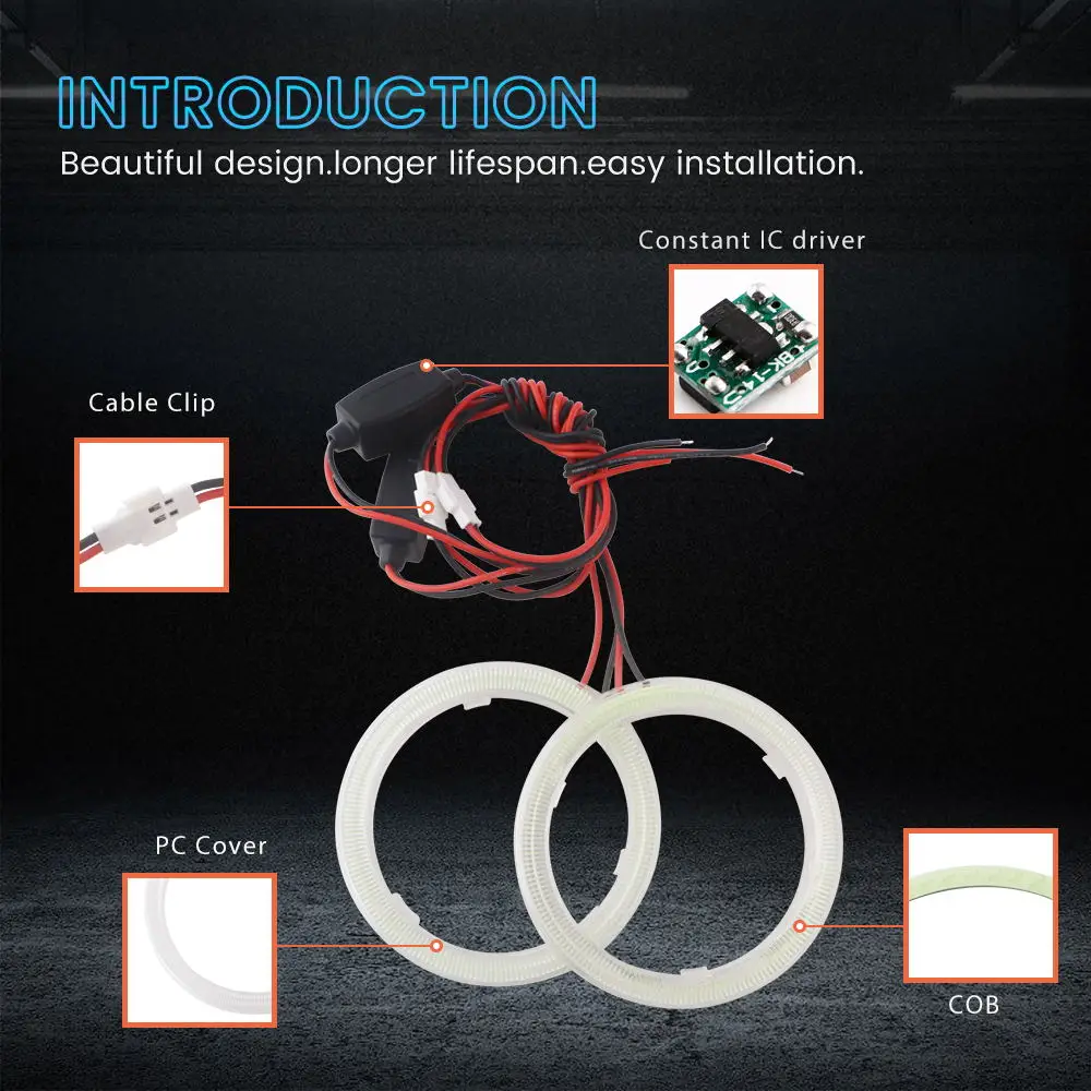 Товар: COB фары ангельские глазки 70 мм Тип светодиодный: ангельские глазки Световой поток: 12 лм/SMD Напряжение: 9-30 В постоянного тока (эта модель имеет постоянный IC драйвер, который может решить общие проблемы с светодиодный сигналом поворота с гипермиганием. Дополнительный стабилизатор напряжения не нужен) Размер: 70 мм Ток: 300 мА Цветовая температура: белый, синий, красный, зеленый, желтый, голубой Широкое применение: его можно использовать для дневных ходовых огней, противотуманных фар, светодиодный фар, ангельских глаз, атмосферных огней, декоративных огней и т. д. подходит для автомобилей, скутеров, мотоциклов, снегоходов и т. д. Подключение провода: Красный провод подключается к положительным/дневным огням, черный провод подключается к отрицательным-простая установка. Гарантия: мы предоставляем возврат в течение 1 месяца или замену в течение 24 месяцев. Посылка включает в себя: 2 кольца (эта модель поставляется с крышкой, диаметр около 3 мм, если у вас есть заказ 70 мм, вы получите внешний диаметр 73 мм с крышкой.)