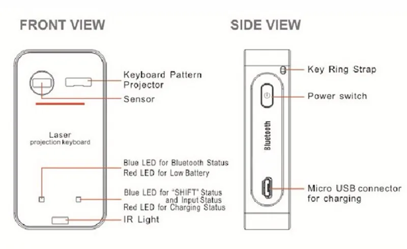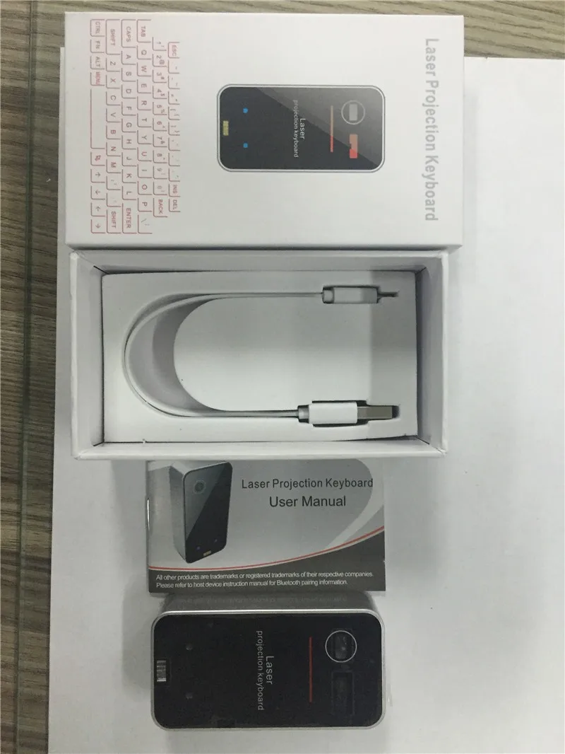 Особенности:100% новый и высококачественный!Английская раскладка клавиатуры QWERTY.Действительно портативный дизайн: идеально подходит для поездок.Полноразмерный шаг клавиш и сочетания клавиш для удобства работы.Превосходная долговечность (без подвижных компонентов внутри).Встроенный литий-ионный полимерный перезаряжаемый аккумулятор для мобильности и удобстваСовместимость с новейшими операционными системами: для Windows XP и новее, для Windows Phone 7 и новее, для iOS4 и новее, для Android 2,1 и новее, для Mac OS X и новее.Спецификация:Раскладка клавиатуры проектора прибл. Шаг 19 ммИсточник светильник: красный лазерРазмер клавиатуры (мыши): прибл. Ширина: 240 мм, Высота: 100 ммРасположение клавиатуры (мыши): прибл. 80 мм от нижней части устройстваПоверхность проекта: неотражающая, непрозрачная плоская поверхностьСкорость распознавания: прибл. До 350 символов в минутуРабочая поверхность: любая прочная плоская поверхностьВнешний источник питания: питание от USB/менее 5 В, 500 мААккумулятор и емкость: литий-ионный полимерный аккумулятор, 700 мАч (МА X) @ 3,7 вВремя работы аккумулятора: прибл. 150 минВремя зарядки аккумулятора: прибл. 90 минСовместимость с Bluetooth (bm20730): V3.0, HID Profile Ver 1,0Частотный диапазон: 2402-2480 МГцКанал: 79Модуляция: GFSKРазмер продукта (мм): 78 мм x 40 мм x 20 ммВес продукта (г): 60 гЦвета: серебристый + черныйПосылка1 x клавиатура для лазерной проекции1 х USB кабель1 х Руководство пользователя1 x Краткое руководство