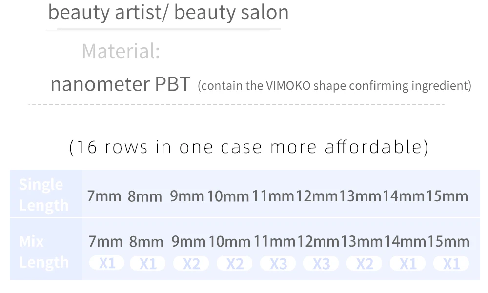 Название: ручное изготовление ресницМатериал: нанометровая ПБТ (содержит специальные ингредиенты VIMOKO, которые исследуются исключительно командой NAGARAKU)Емкость: 16 линий в одном лотке, более доступнаяЛоконы: C DТолщина: 0,07 ммДлина: 7 мм, 8 мм, 9 мм, 10 мм, 11 мм, 12 мм, 13 мм, 14 мм, 15 мм, 16 мм, Микс 7-15 мм