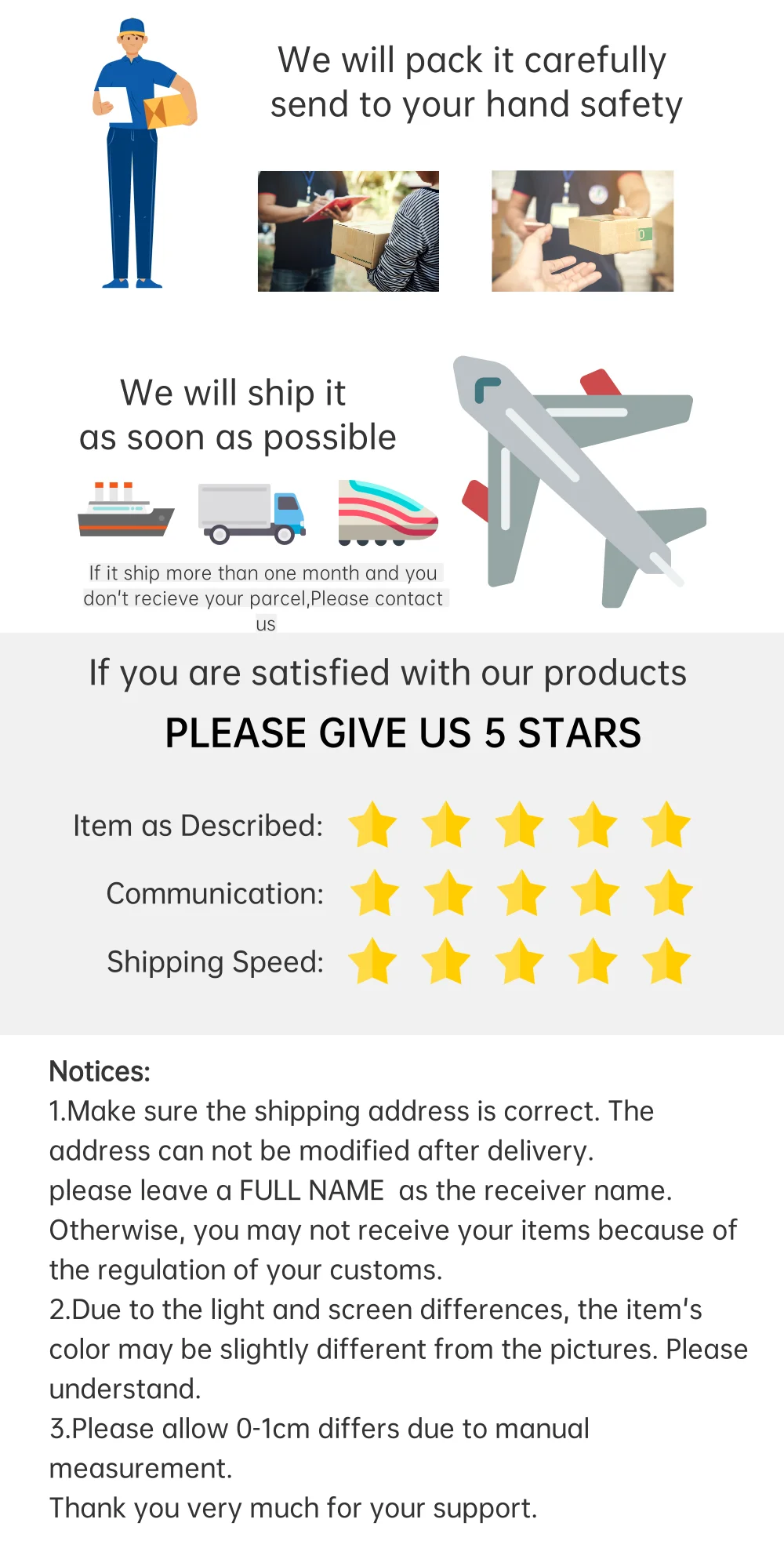 Ваше удовлетворение-наша главная цель, и ваши отзывы очень важны для нас.Мы хотим, чтобы наши клиенты были на 100% удовлетворены своим заказом.Когда вы получите свой заказ, пожалуйста, уделите немного времени, чтобы оставить нам положительные отзывы, и мы ценим оценку 5 звезд,Это жизненно важно и очень ценно для дальнейшего успеха нашего бизнеса.Если вы не удовлетворены, пожалуйста, напишите нам, прежде чем оставлять нейтральные отзывы и негативные отзывы,И, пожалуйста, дайте нам 1 рабочий день, чтобы решить вашу жалобу. Ваше полное удовлетворение является нашей обязанностью.