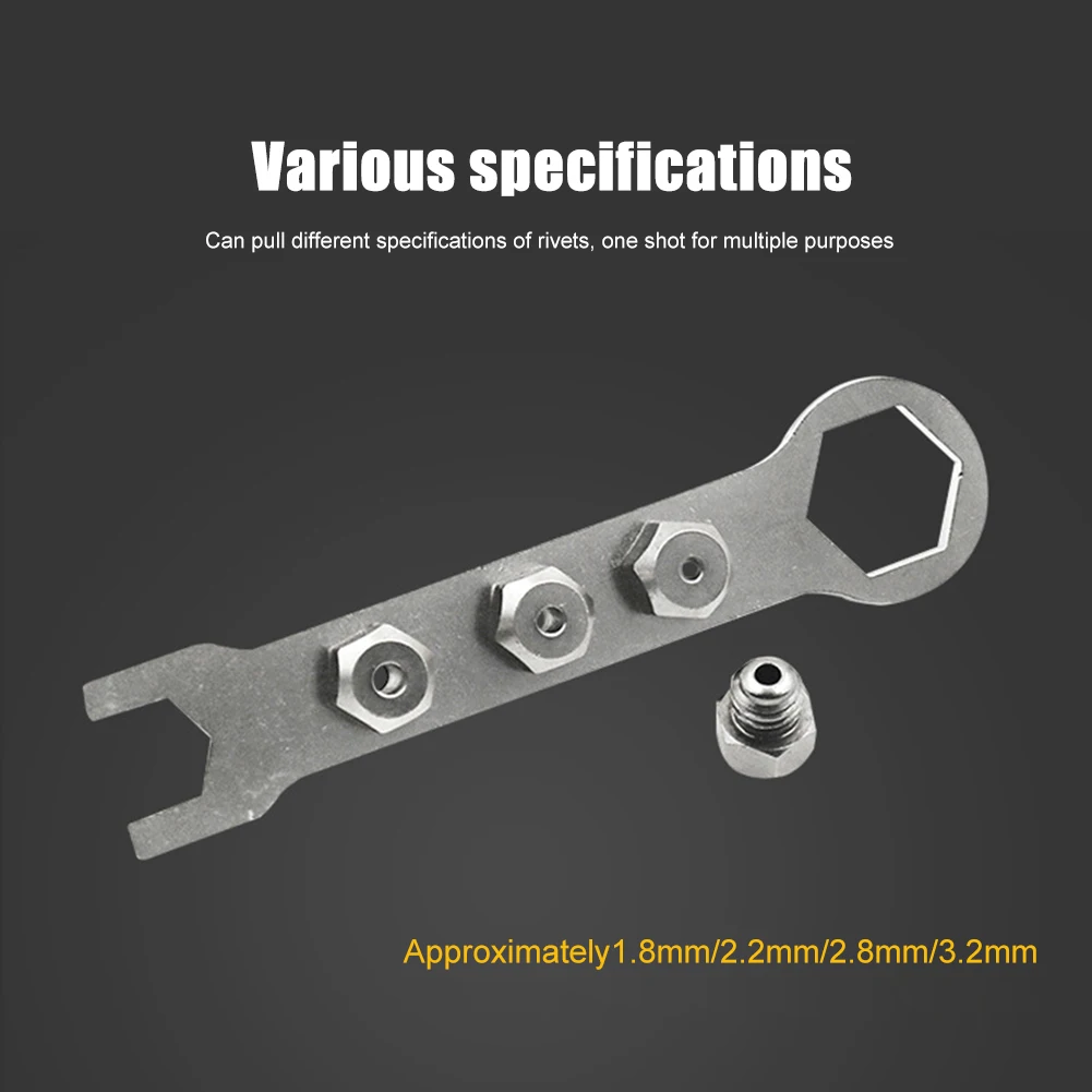 4. Она включает в себя четыре сопла размеры 1,8 мм, 2,2 мм, 2,8 мм и 3,2 мм, которая используется для заклепки разных размеров.