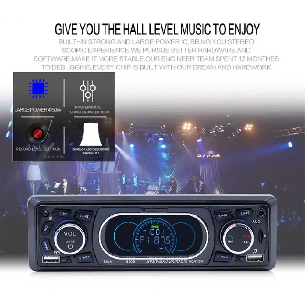 SWM-8809 многофункциональный двойной USB Hands-free Звонки Bluetooth в автомобиле Hands Free MP3-плеер Описание: Умный MP3-плеер Bluetooth может подключать мобильный телефон по Bluetooth для воспроизведения музыки, развлечений и навигации по карте через автомобильный стерео, который может расширить развлекательный диапазон в автомобиле через воспроизведение аудио автомобиля. Он поддерживает WAV, MP3, WMA формат музыки и может обеспечить безопасность вашего диска. С большим дизайном кнопок и функцией идентификатора звонящего, MP3-плеер Bluetooth очень удобен для ответа/зависания звонков, зарядки ваш мобильный телефон и диск. Благодаря автоматическому сочетанию функций Bluetooth, умный чип MP3-плеера Bluetooth может автоматически совпадать с Bluetooth, он имеет сильный сигнал и совместим с системой Android/Apple, обработка фонового шумоподавления делает автомобильные музыкальные телефонные звонки более четкими. Более того, он имеет fm-радио, отображение времени переключения и может прехранить 18 радиостанций, что удобно и быстро смотреть время и гарантирует безопасность вождения. Функция воспроизведения памяти отключения питания может запоминать частоту/трек, после выключения и перезапуска песня начнет воспроизводить из отключенной песни. Изготовлен из пластика и металлических материалов, который является прочным, удобным в использовании. Длина Музыкального Проигрывателя Bluetooth составляет 188 мм, ширина-58 мм, а высота-68 мм. Подходит для воспроизведения музыки, развлечений, навигации по карте во время вождения. Название товара: Автомобильный MP3 музыкальный плеер Материал пластик, металл Совместимые модели: SWM-8809 Батареи: со встроенным аккумулятором CR2025 150 мАч на пульте дистанционного управления Напряжение питания: 12 В Дисплей/Сенсорный экран: VA Bluetooth: Bluetooth 4,0 Тип интерфейса: двойной USB интерфейс Модель декодирования: CW6633E Формат аудио: MP3 WMA WAV Экран: ЖК-дисплей Сочетание: BT USB AUX TF Fm-радио частота: 87,5-108 МГц Радиосвязь: FM1 FM2 FM3 Радиочип: QN8035 Чип усилителя мощности: TDA7377 Кнопочный светильник: синий светильник Размер: 18,8 см x 5,8 см x 6,8 см/7.4inx2.28inx2.68in Примечания: Благодаря светильник и экрана Цвет Товара может быть s светильник ly отличается из-за характеристик монитора компьютера. Возможны незначительные отклонения в размерах из-за различных измерений вручную. Посылка включает в себя: 2 X ключи для разборки 2 X провода питания 1 X Руководство пользователя 1 пульт дистанционного управления 1 х музыкальный плеер