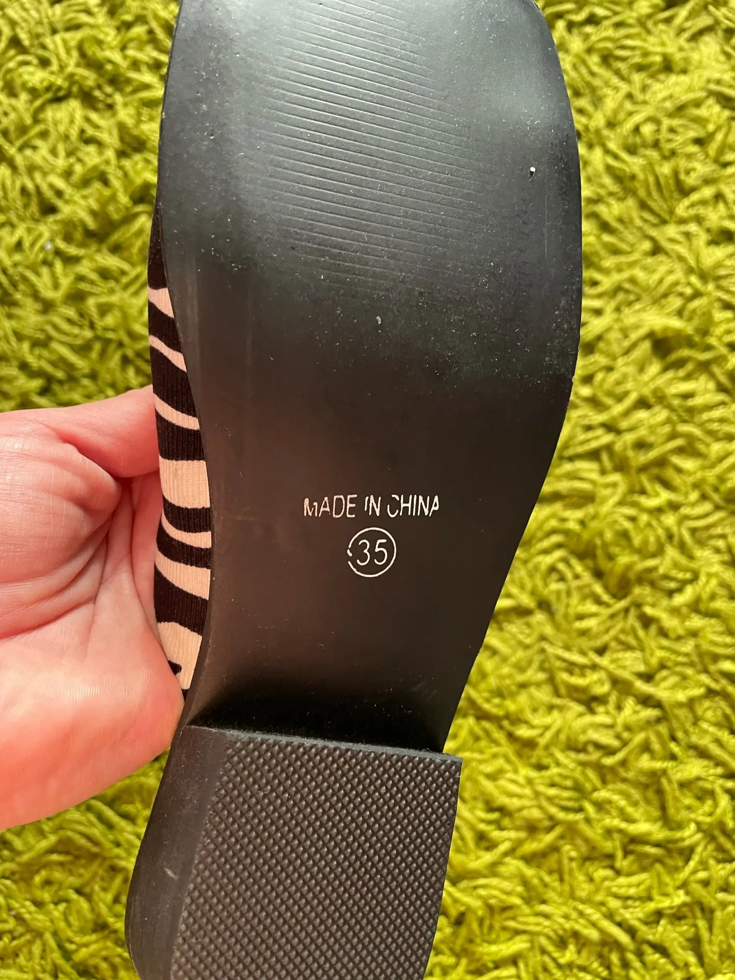 Короче, я плохо рассмотрела… если быть внимательнее, то заметно, что тапочки-зебра сверху текстильные. Вообще аккуратно сидят, жестковатые сразу. Размер точный, возможно надо полразмера больше брать, мой 35 на 35 впритык.