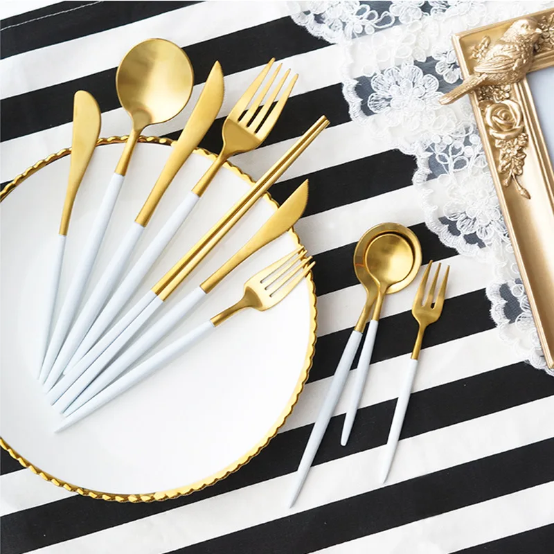 Из белого золота набор посуды материя набор серебряных изделий 304 Нержавеющаясталь столовые приборы кухонный нож, ложка палочки для еды набор Европейской посуды