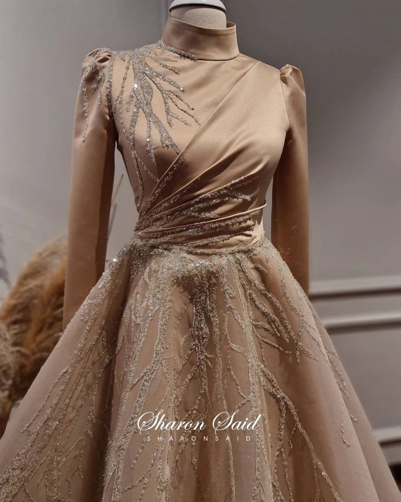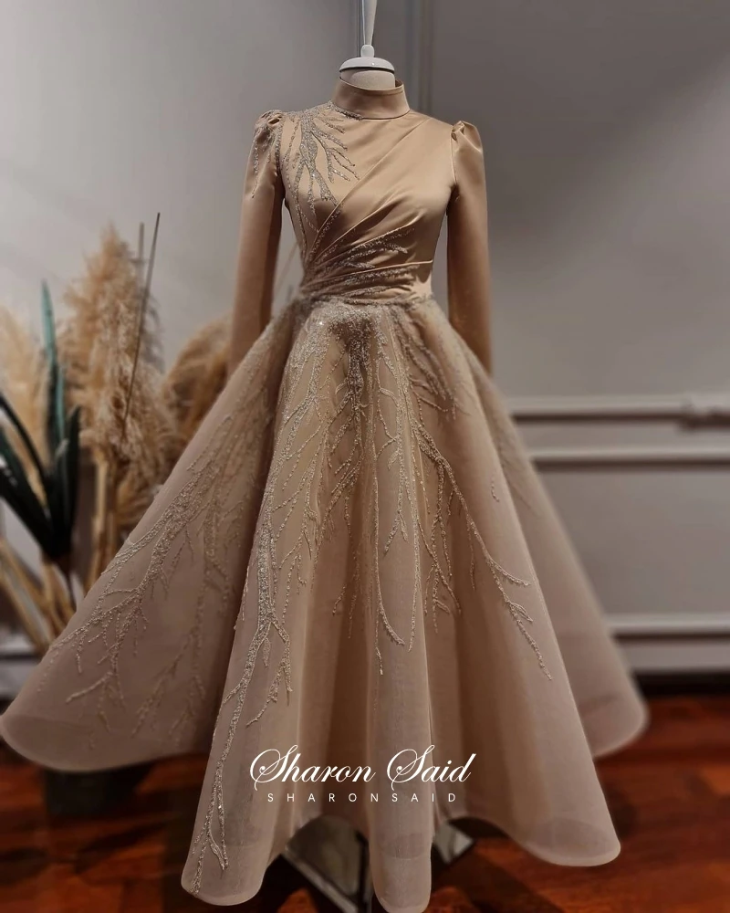 Роскошные вышитые бисером вечерние платья цвета шампанского с длинным рукавом элегантное женское свадебное платье Дубая арабское официальное платье средней длины SS414