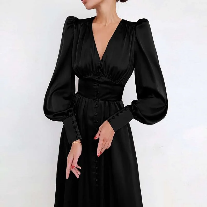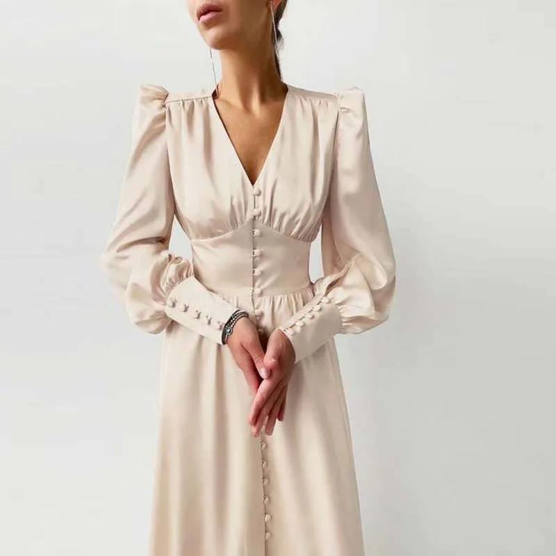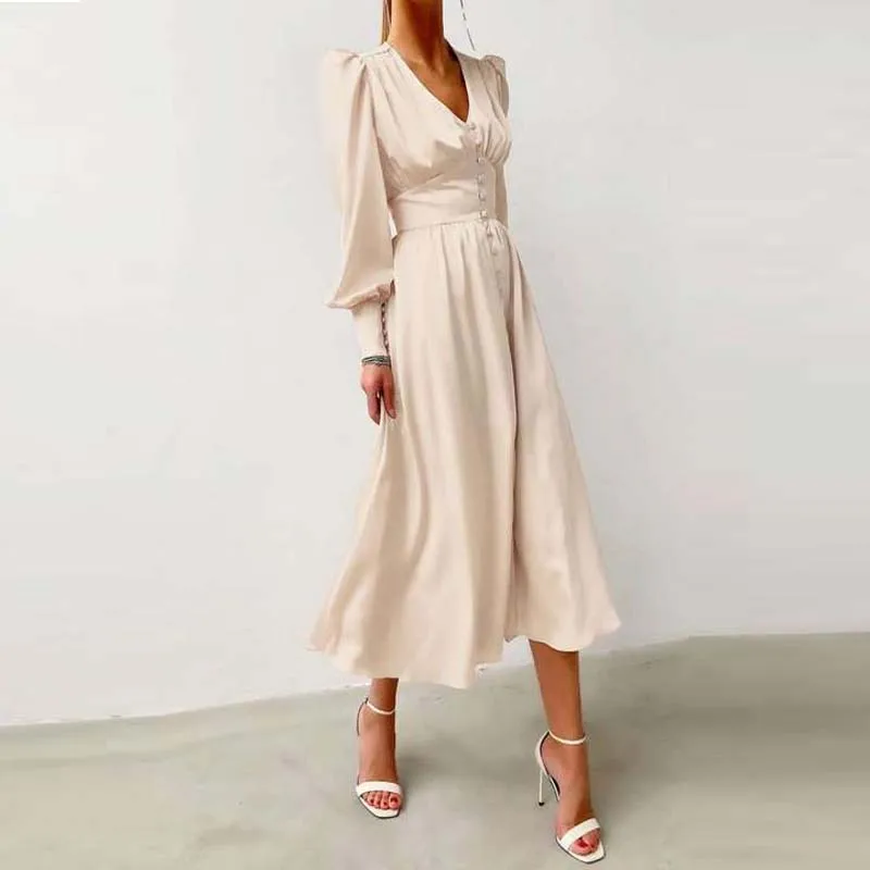 Женское однобортное атласное платье миди, бежевое привлекательное длинное платье с рукавами-фонариками, высокой талией и V-образным вырезом для вечерние НКИ и клуба, на весну