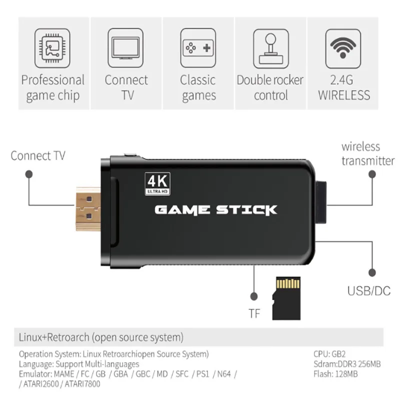 Поддержка 10 симуляторов (CPS FC GB GBA GBC MD SFC N64PS1ATARI arcade) поиск, Коллекционирование, прерывание в архиве, вход в режим passion в любое время 2,4G беспроводная ручка с двойным перекидным механизмом, подключение телевизора/монитора/проектора HD выход, поддержка расширения 64G
