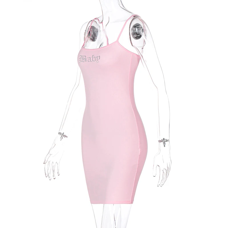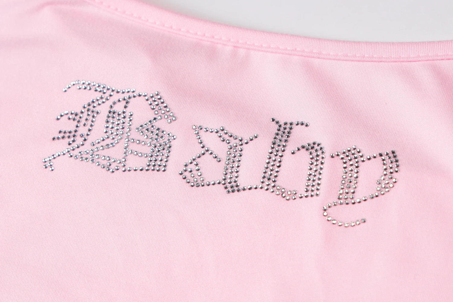 Платье на бретелях с надписями, розовое короткое, стразы, лето 2000