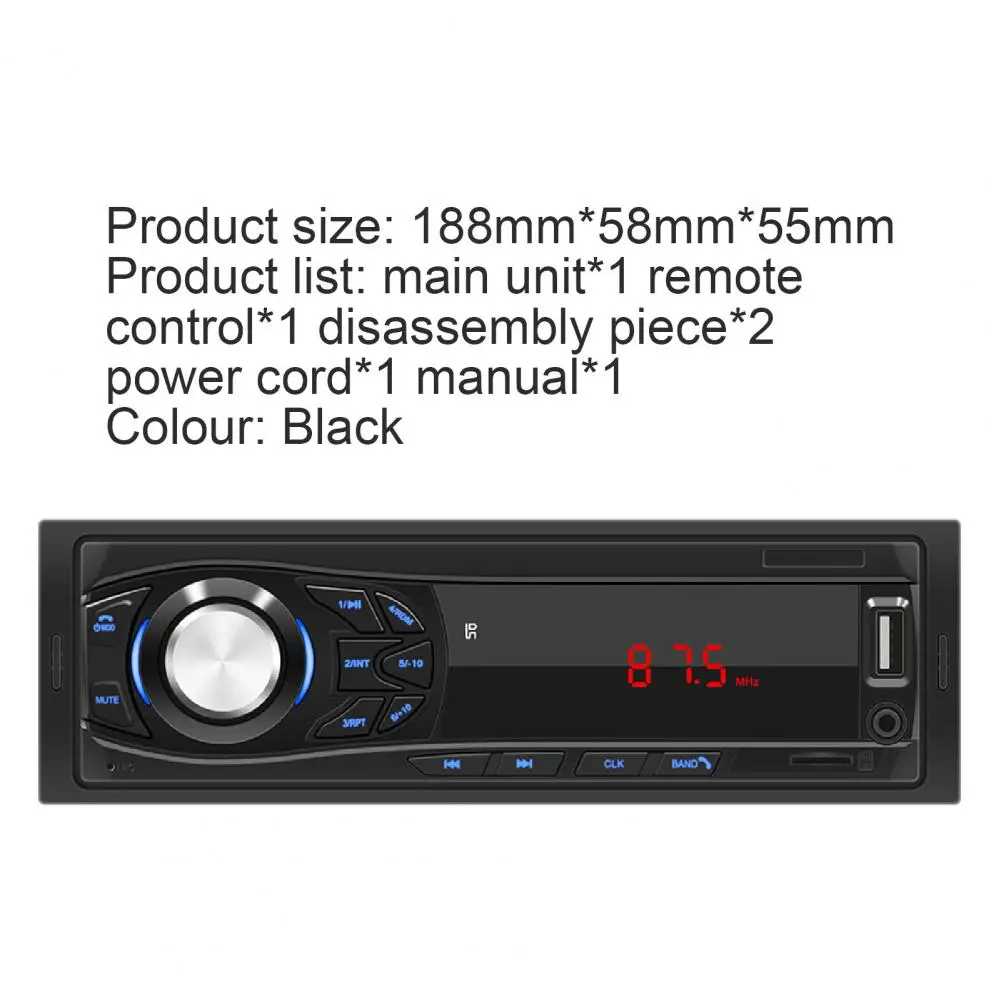 1030 12 в мощный универсальный FM радио плеер компактный Bluetooth AUX U диск MP3 радио плеер для автомобиля центральное управление модификация Описание: Поскольку он имеет несколько функций, вы можете использовать его, чтобы узнать последние условия дорожного движения, слушать финансовые отчеты, слушать музыкальные передачи, или Получайте информацию или новости в реальном времени с помощью функции FM-радио. И вы не будете чувствовать себя одиноко, когда вы едете в одиночестве с сопровождением многих радиостанций. Поддержка функций соединения Bluetooth, функции громкой связи, FM-радио, зарядки телефона, отображения времени, карты памяти, воспроизведения музыки MP3, пульта дистанционного управления, чтения через USB, входа AUX, память при отключении питания и выход RCA, очень мощный автомобильный mp3-плеер. Автомобильный MP3-плеер, изготовленный из высококачественного пластика и металла, прочный и надежный, обладает хорошей защитой от царапин и коррозии. Длина автомобильного MP3-плеера 18,8 см, ширина 5,8 см, высота 5,5 см. Универсален для автомобилей с напряжением 12 В и подходит для модификации Центрального управления автомобилем. Название товара: автомобильный mp3-плеер Материал: пластик, металл Батареи: пульт дистанционного управления: Встроенный CR2025 150 мАч (входит в комплект) Выходная мощность: 45 Вт Bluetooth: поддержка Напряжение источника питания: 12 В Тип: 1030 Модель чипа декодирования: TY3510 Аудиоформат: MP3 Интерфейс USB: USB2.0 Экран: цифровой дисплей Поддержка входа: AUX/TF карта/U диск/Bluetooth Частота FM-радио: 87,5-108,0 МГц Слот для карты: TF-карта Радиочип: Встроенный чип Чип усилителя мощности: YD1028 Модель экрана светодиодный Вход AUX: Поддержка Размер: 18,8 см x 5,8 см x 5,5 см/дюйма x дюйма Примечания: Из-за разницы в освещении и настройках экрана цвет изделия может немного отличаться от изображения. Возможны незначительные различия в размерах из-за различий в измерениях вручную. Посылка входит: 1 X Кабель Питания 2 X разборные детали 1 х пульт дистанционного управления 1 х Руководство пользователя 1 автомобильный mp3-плеер