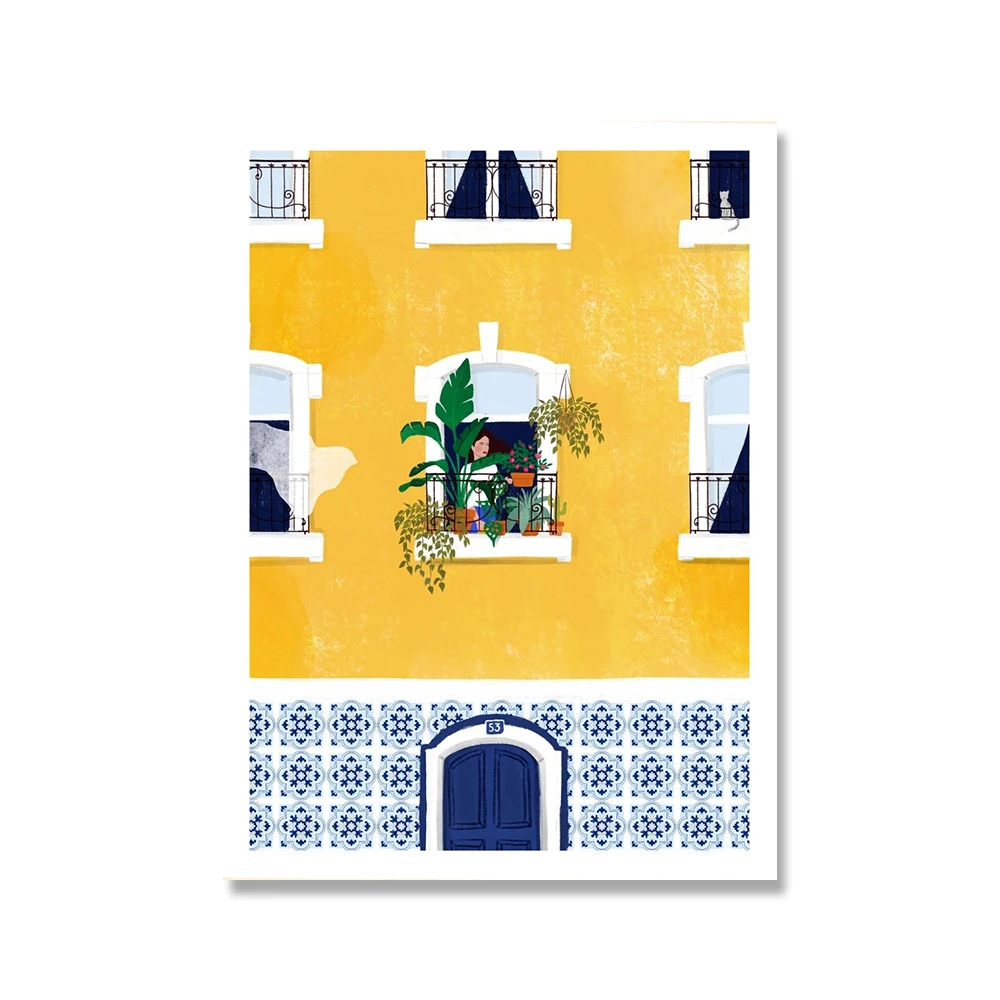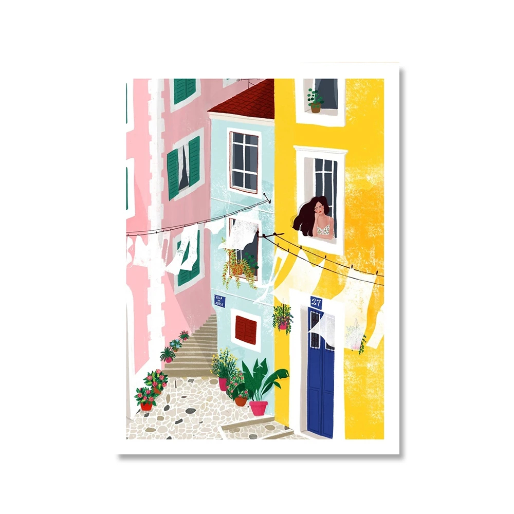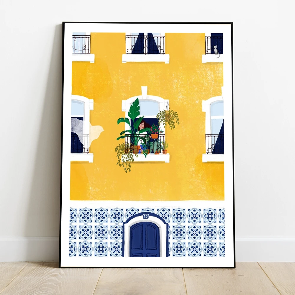 Иллюстрация девочки из Лиссабона, настенная живопись, архитектура, кот, женские постеры, подарок, картина для путешествий, украшение для дома