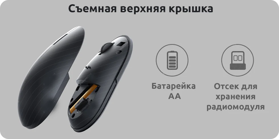 Под монолитной верхней крышкой скрывается отсек для батарейки и компактного беспроводного приемника, для того, чтобы их вытащить нужно всего лишь легонько приподнять крышку, отсоединив ее от нижнего отсека, для того, чтобы установить верхнюю крышку обратно на фиксатор, легонько нажмите.