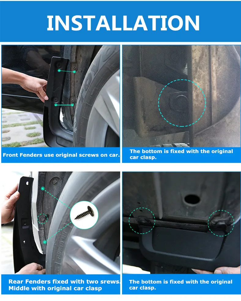 · 4 шт. в комплекте защита от брызг грязи и все необходимые Hardwares · Высококачественный черный АБС-пластик, который является износостойким, термостойким, низкотемпературным.