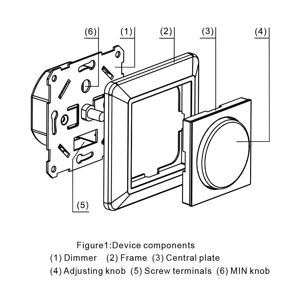 1. Принцип диммирования: отсек фазы задней кромки 2. Встроенная кнопка включения/выключения и поворотная ручка управления затемнением 3. Не требуется нейтральный 4. Минимальная яркость регулируется с помощью минимальной ручки 5. Электронная защита от короткого замыкания с постоянным выключением через 7 секунд 6. Электронная защита от перегрева 120 градусов, автоматически открывается ниже 120 градусов. 7. Возможно переключение в сочетании с переключателем переключения 8. Расширение мощности через силовые бустеры (см. Инструкции по бустеру питания) 9. Мерцание подключенных ламп из-за занижения указанной минимальной нагрузки или через централизованные импульсы от мощности