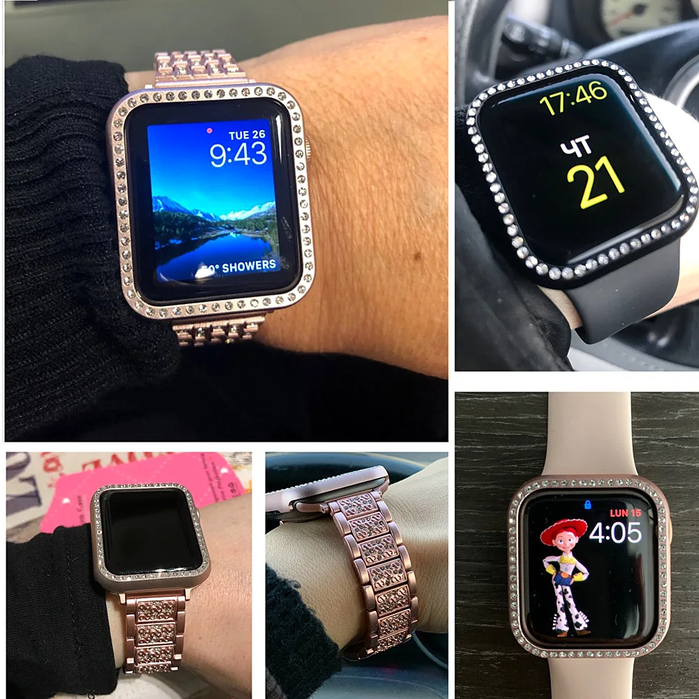 Крышка для Apple watch чехол 44 мм 40 мм, для iWatch, версия 3, 42 мм 38 мм и нержавеющая сталь металлический корпус Чехол-бампер с алмазами протектор для наручных часов Apple watch серии 6 5 4 se аксессуары