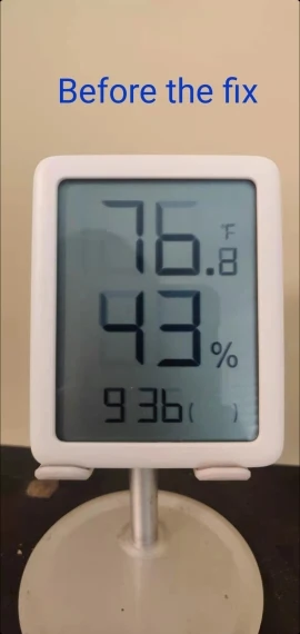 Термометр приходит без повреждений, но дисплей thr не работает должным образом из-за плохого подключения батареи. Аккумулятор не полностью опускается на свое положение с помощью крышки батареи, ЖК-дисплей не получает полного напряжения и вызывает сломанную цифру на дисплее. Зафиксируйте его, поставив несколько бумаги между батареей и крышкой аккумулятора, чтобы плотно нажмите на батарею, с тех пор все хорошо