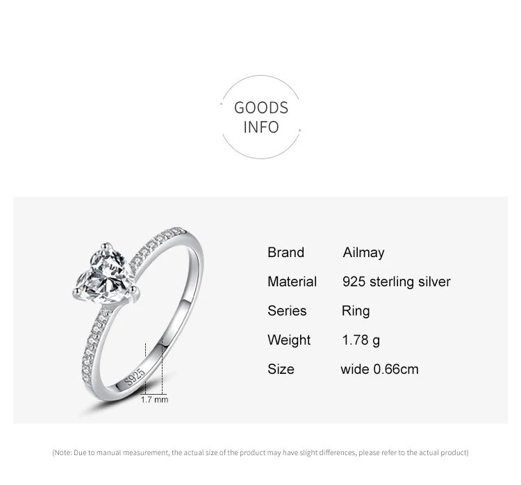 Ailmay реальные 925 стерлингового серебра в форме сердца CZ Кольцо игристое Шарм кольцо на палец для женщин, с ремешком; Классические свадебные ювелирные изделия, ювелирные изделия