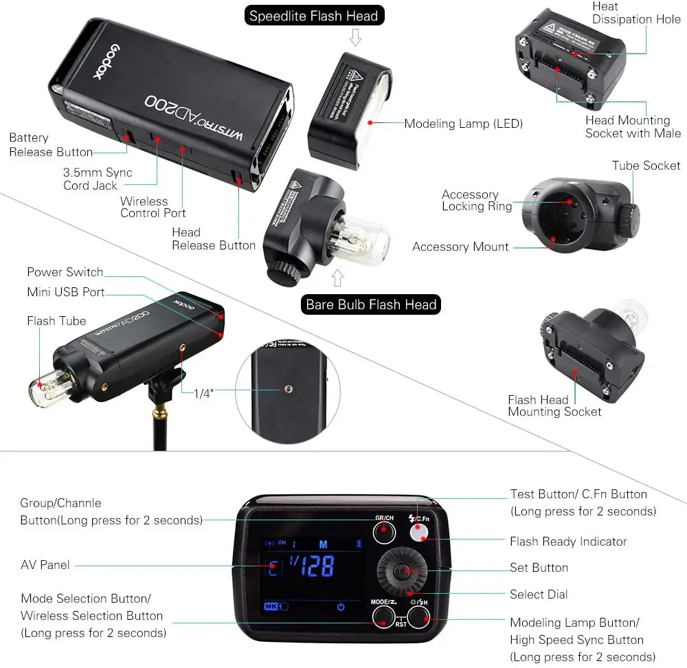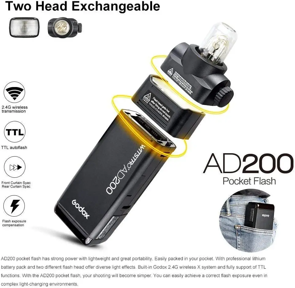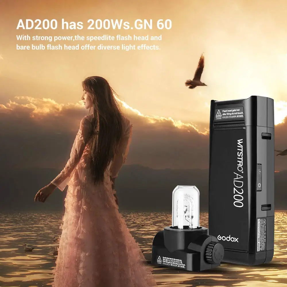 Вспышка Godox AD200, 2,4 Вт, 18000G, TTL, 2900, высокоскоростная, монолитная, литиевая батарея мА ч