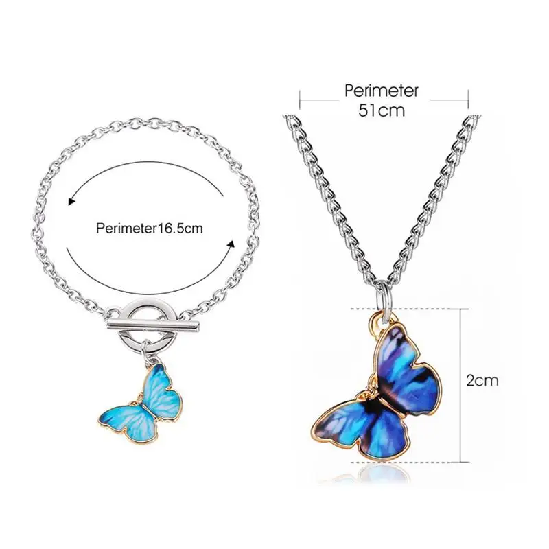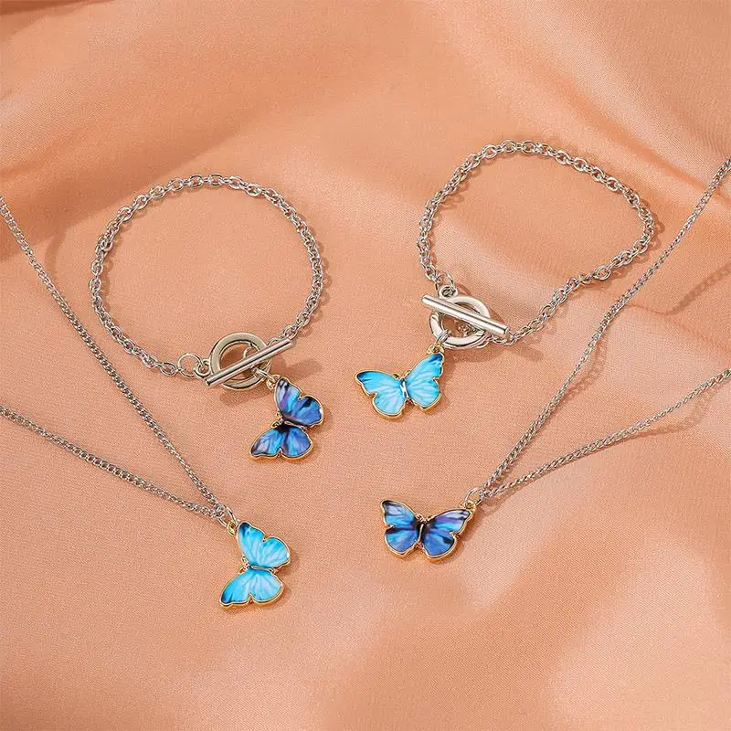 Чехол с изображением синей бабочки для женщин ожерелье браслет бабочки кулон простое серебряное Цвет милый в богемском стиле для девочек C