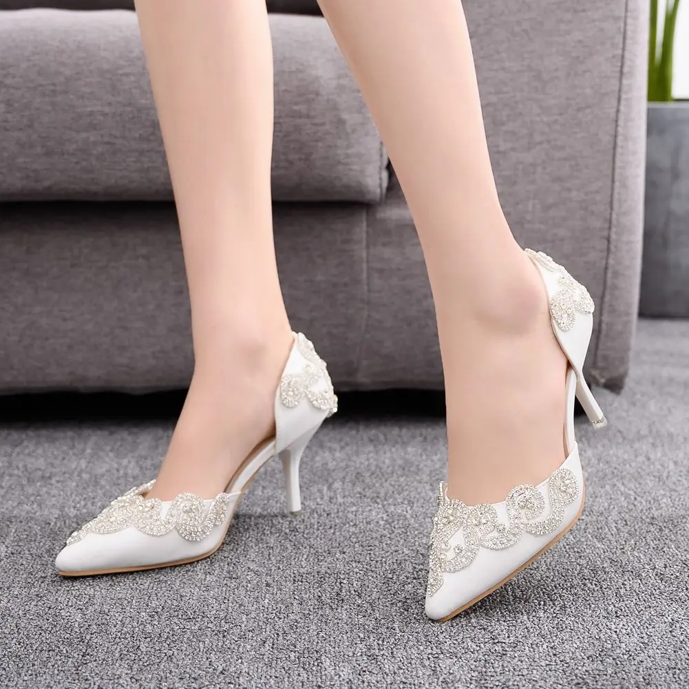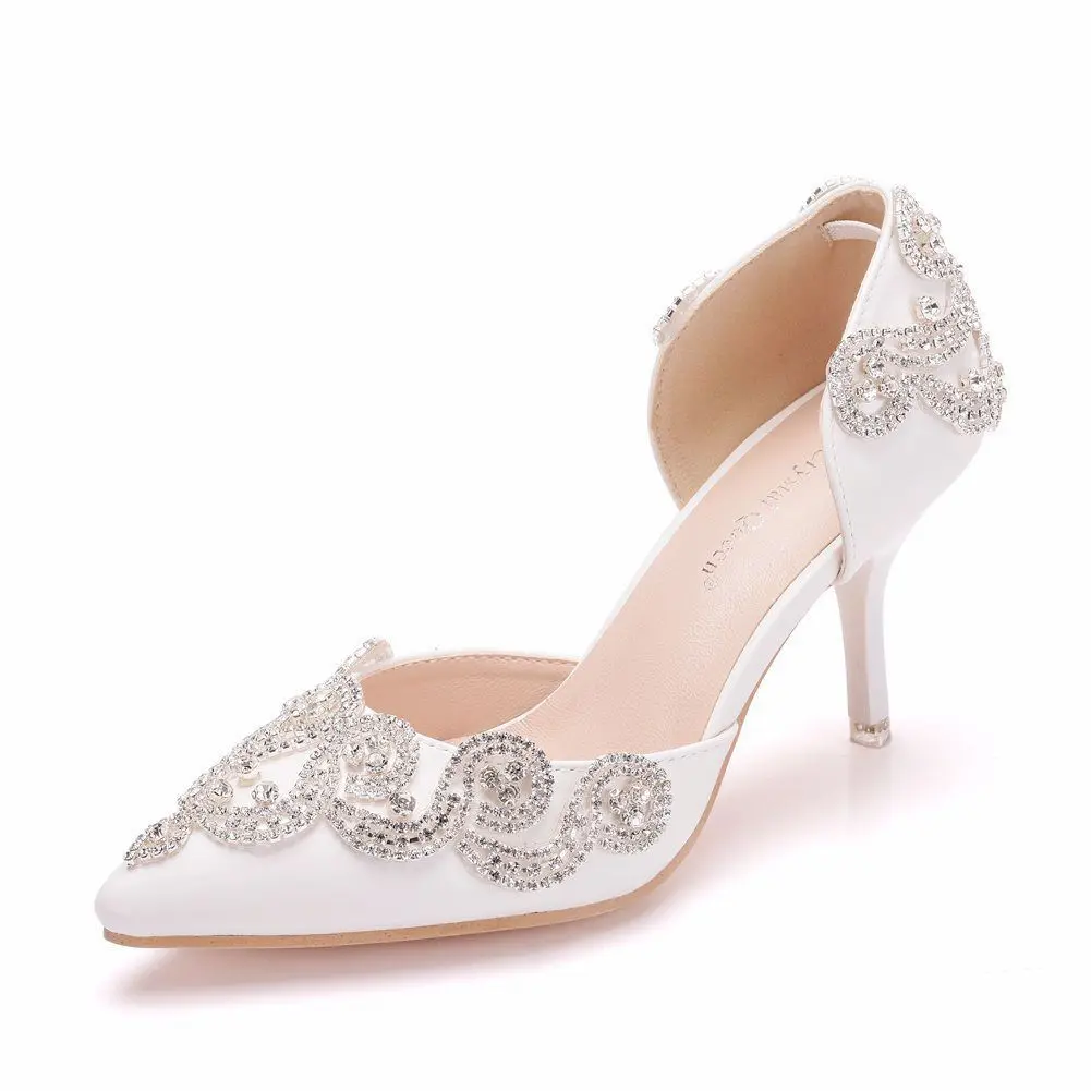 Белые свадебные туфли Стразы с острым носком на тонком высоком каблуке женские сандалии для вечерние ринки банкета подружки невесты на каблуке с крышкой B0063