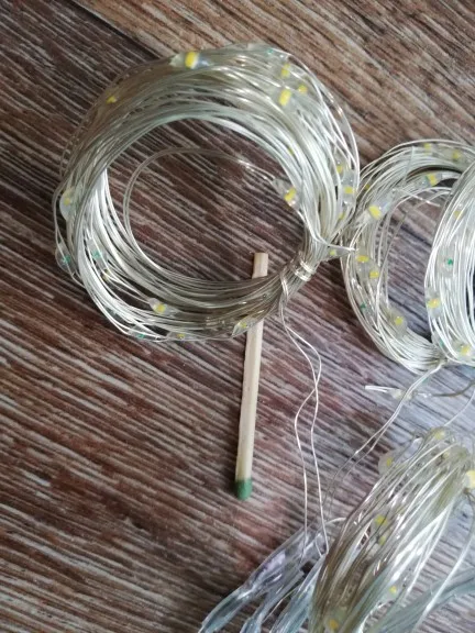 Провод гирлянды очень тонкий! Толщина провода на фото. Для сравнения рядом спичка. Как я понимаю гирлянда на один раз. Упаковать второй невозможно. Своих денег точно не стоит!