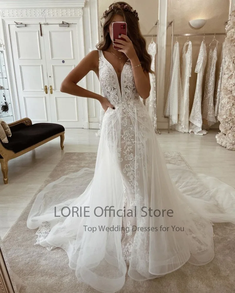 Свадебное платье-Русалка LORIE в стиле бохо с V-образным вырезом, кружевное свадебное платье с аппликацией, индивидуальный пошив, богемное свадебное платье, 2021 Robe de mariage