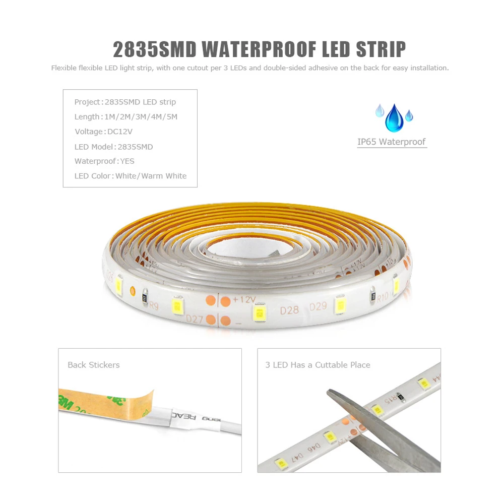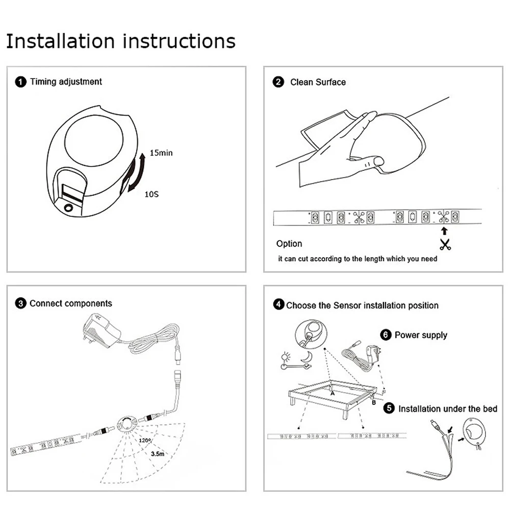 Примечание: Во-первых, пожалуйста, проверьте, правильно ли вы подключить светодиодную ленту. Если соединение неправильное, светильник всегда будет включен. Во-вторых, Светодиодная лента с датчиком движения работает только в темных условиях. Поэтому, пожалуйста, проверьте ночью. Характеристики: Тип: Светодиодная лента 12 В 2835 с датчиком движения и адаптером питания 2A Тип светодиодов: 2835SMD Светильник Цвет: белый/теплый белый Цветовая температура: белый (6000k-6500K); Теплый белый (2700K-3500K) Расстояние срабатывания: 1 м-3 м Время задержки: 10 сек-5 мин (регулируется) Длина светодиодной ленты: 1 м/2 м/3 м/4 м/5 м Количество светодиодов: 60 светодиодов/м Класс водонепроницаемости: IP65 Упаковка: 1 Светодиодная лента 1 x светодиодный блок управления датчиком движения 1 x адаптер питания 2A (штепсельная вилка США или штепсельная вилка европейского стандарта)