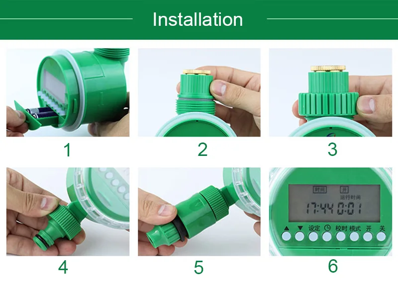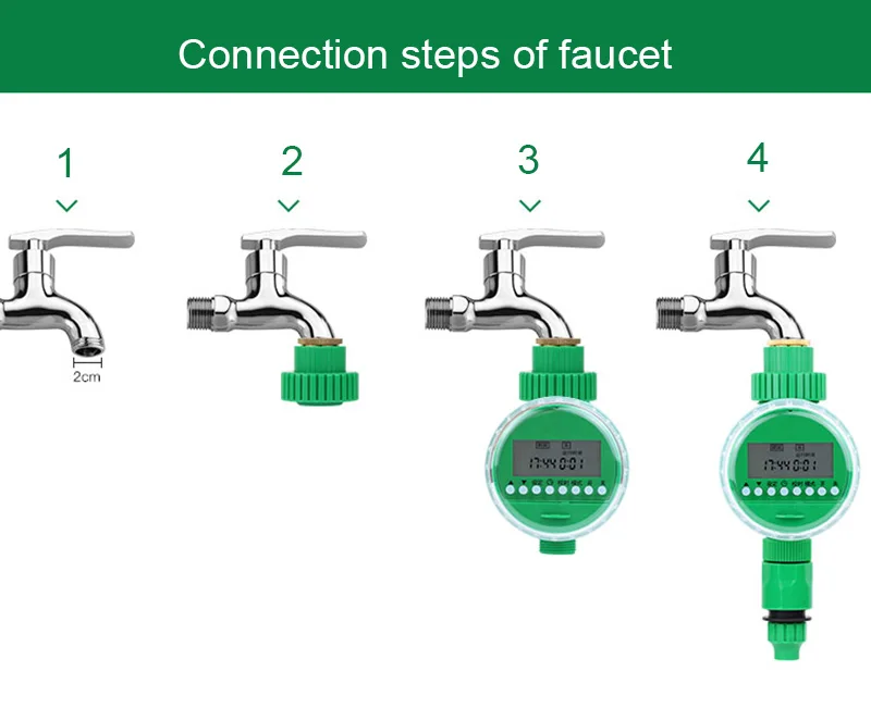 1. Установите батарею.2. Подключите кран.3. Вы можете повернуть кнопку на "частоту", которую вы можете установить, как часто вы хотите поливать свои растения.4. Поверните кнопку на "время воды" и вы сможете задать время для полива растений.