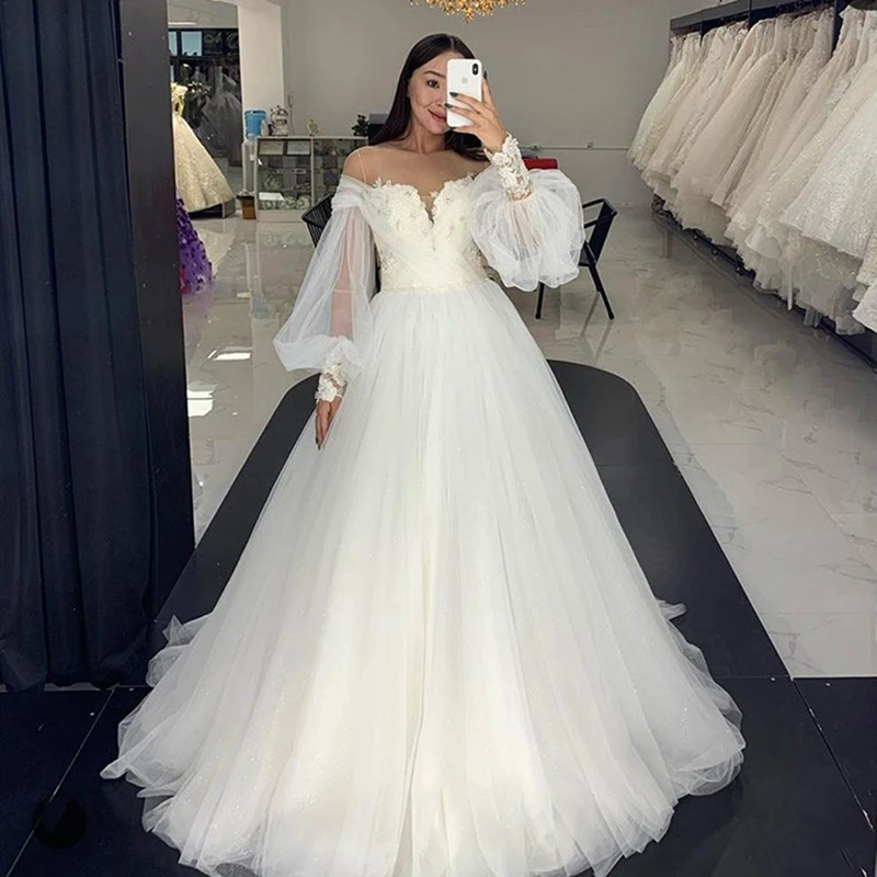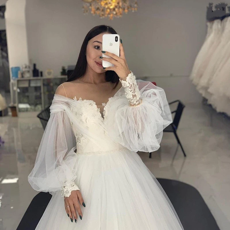 Принцесса Стиль Длинное Пышное Платье с длинным рукавом свадебные платья, из прозрачной ткани аппликация кружево Тюль трапециевидной формы свадебные платья 2021 Vestido De Noiva