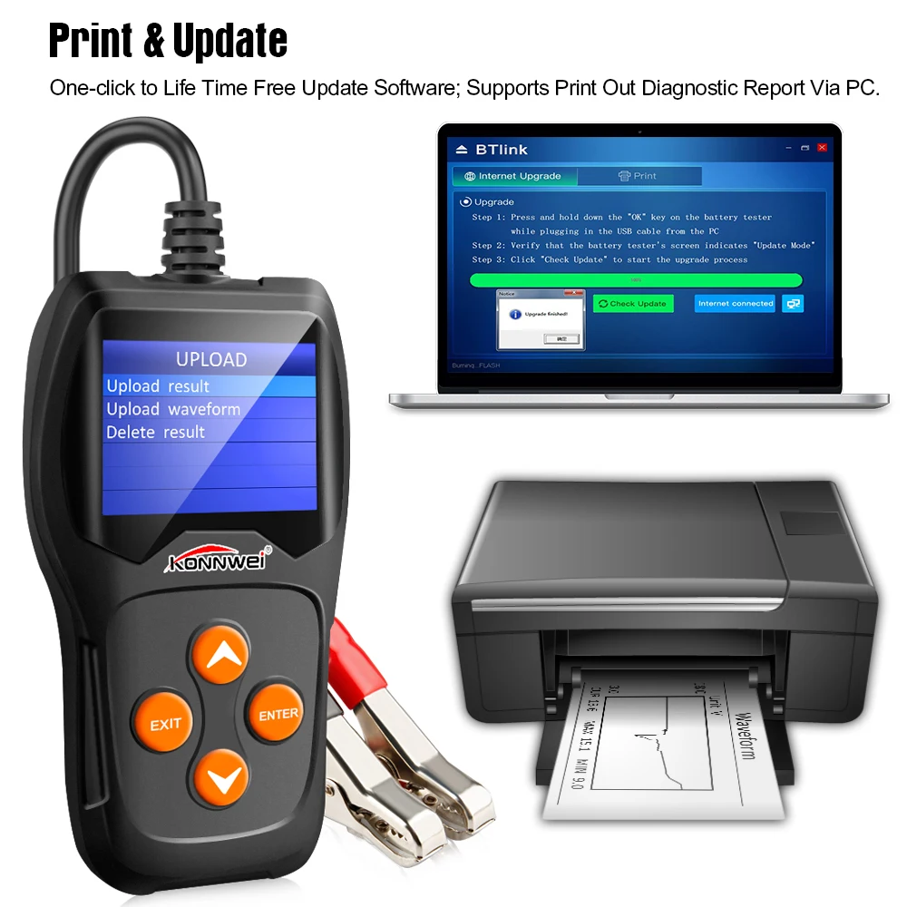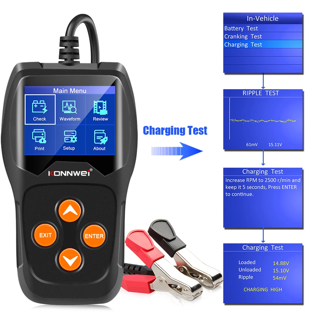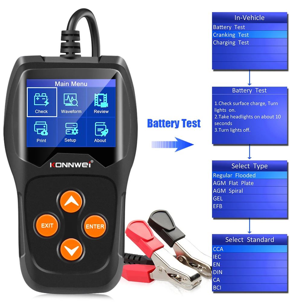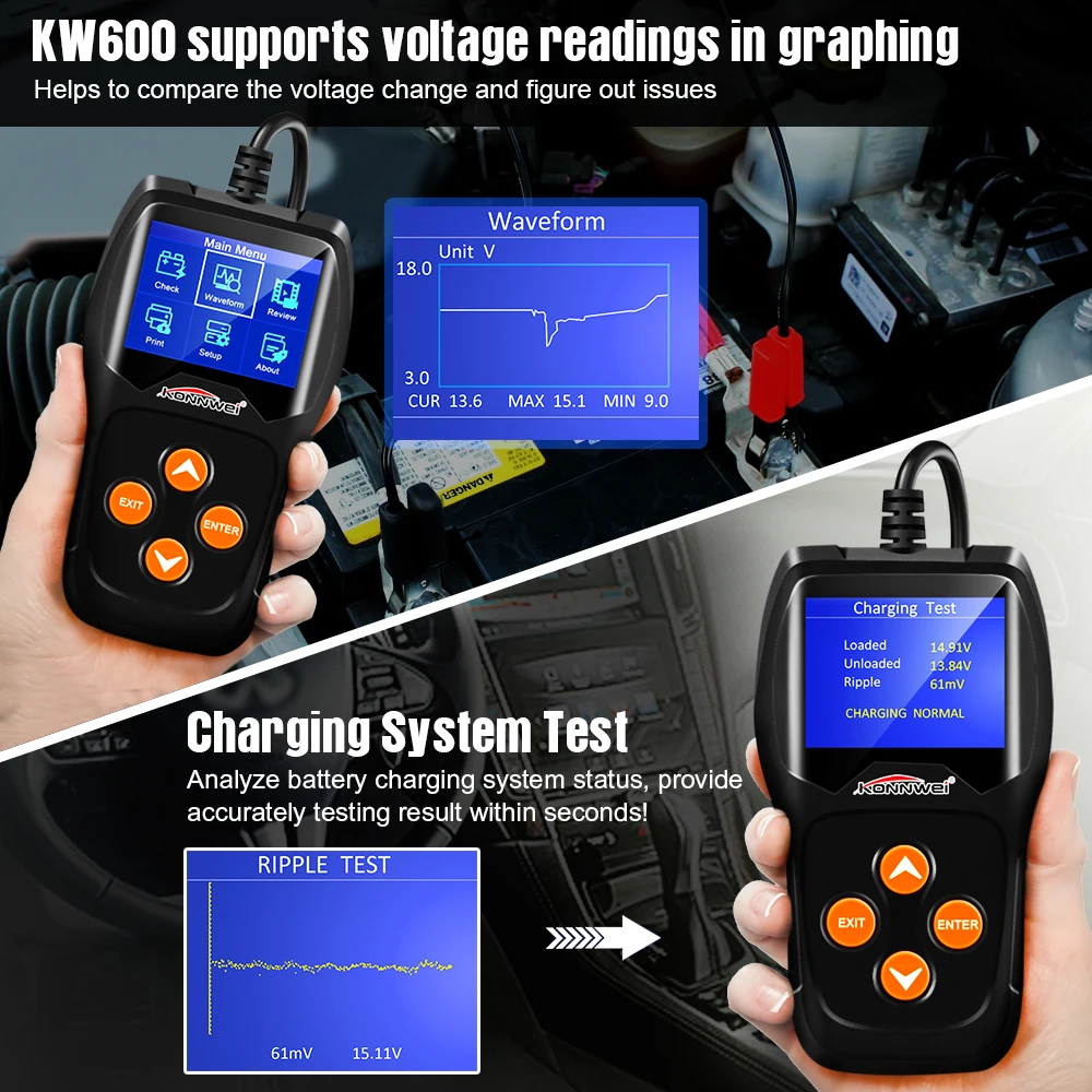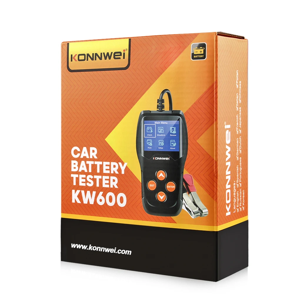 KONNWEI KW600-это новый аккумулятор-тестер, обновленный от старого классического тестера с подсветкой на рынке, направленный на быструю и точную проверку здоровья батареи, а также на проверку рабочего состояния генератора. Это профессиональный диагностический инструмент транспортного средства для проверки проблем с системой батареи с помощью инструмента мониторинга напряжения с графическим изображением, с цветным экраном и уникальным дизайном узора, бесплатным обновлением в течение всего срока службы, KONNWEI KW600-идеальный инструмент для тестирования батареи для вашей работы и семьи.