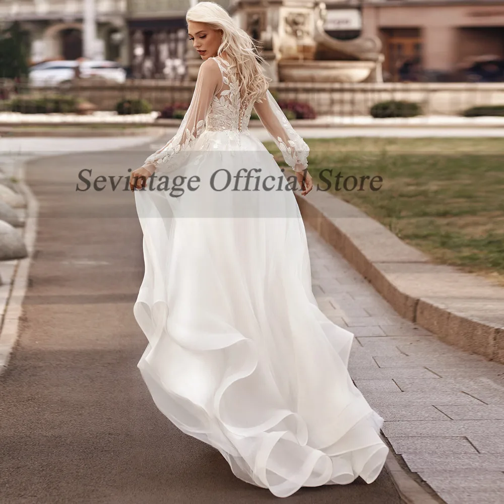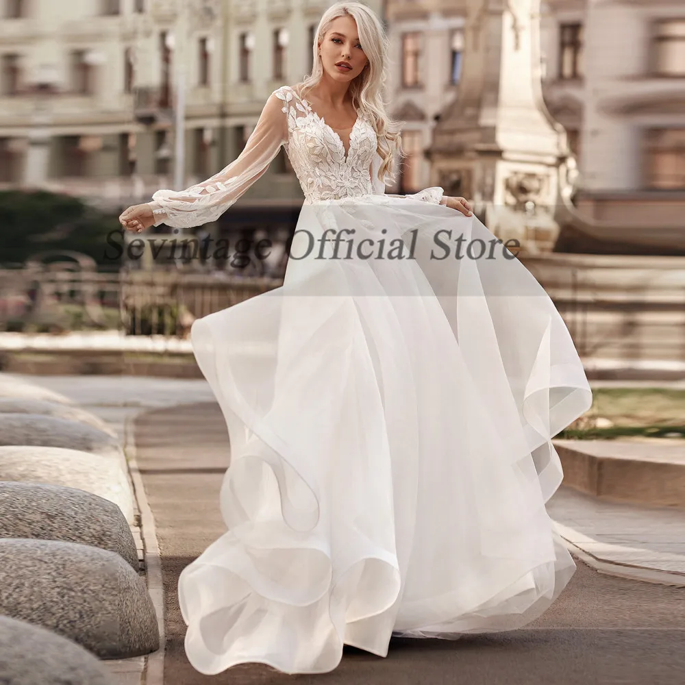 Изящные кружевные свадебные платья 2021, платье невесты цвета слоновой кости с аппликацией и V-образным вырезом и длинными рукавами, индивидуальный пошив, пляжные свадебные платья принцессы