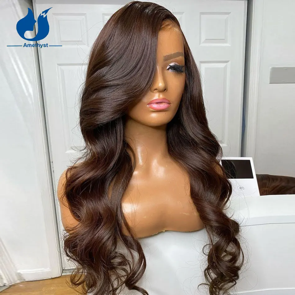 Аметист 150 плотность коричневый цвет 13X6 кружево Передние человеческие волосы парик бразильские Реми мягкие волнистые кружева передние парики Brown16-24inch волос парик