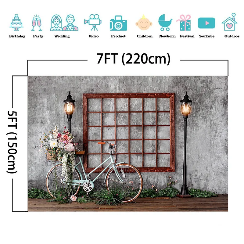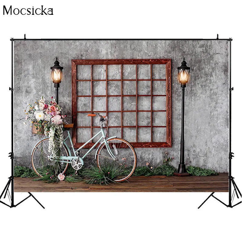 Весенние серые фоны на стену окно уличный фонарь велосипед цветы деревянный пол фон для фотосъемки Дети День рождения Фотостудия