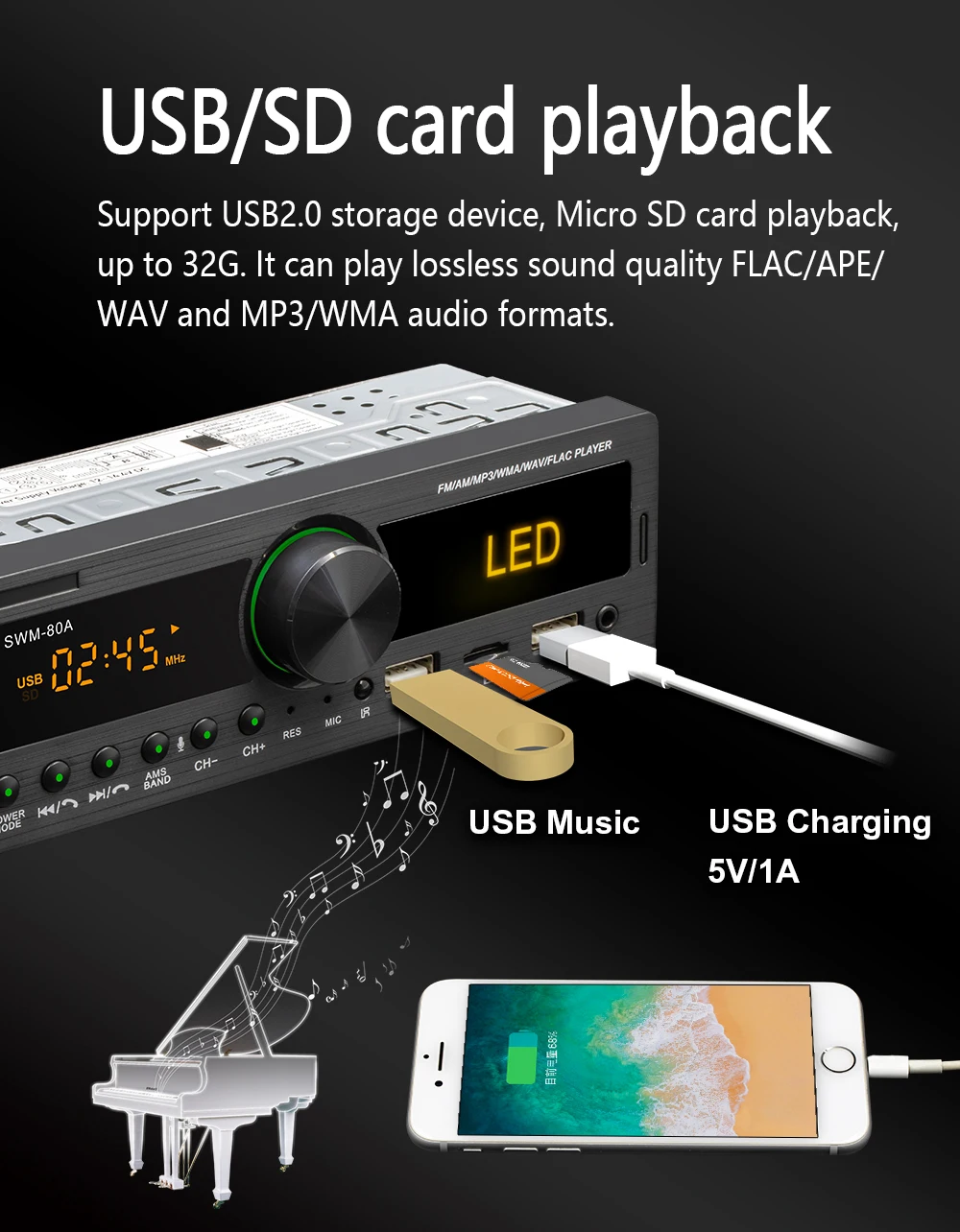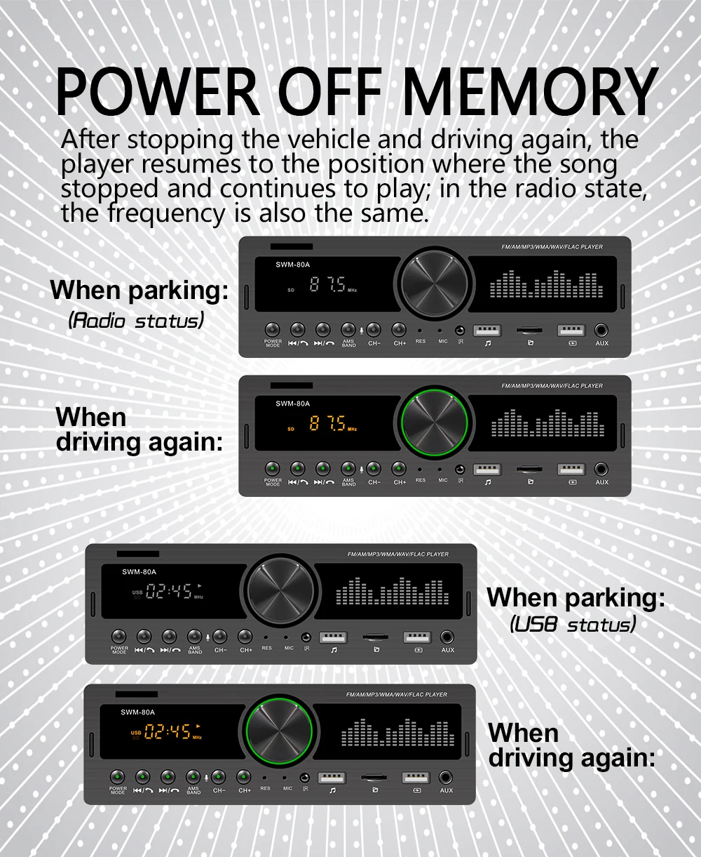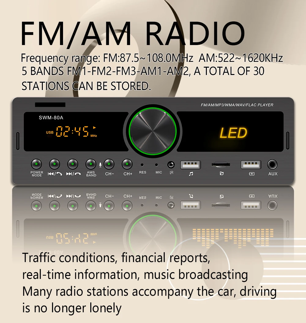 Специальное Перо:1. Голосовой помощник.2. Найдите автомобиль (Только для option''BT find Radio'') Через бесплатное приложение.(После парковки телефон может запомнить место парковки и перейти к тому месту, где в то время была парковка)3. Запись источника звукаМногофункциональный Bluetooth автомобильный mp3-плеерСпецификация продукта:Встроенный Bluetooth + микрофонПоддержка громкой связиПоддержка расширенного режима передачи звукаПоддержка индикации часов во время отключения питания высококачественное цифровое стерео fm-радиоПоддержка трехдиапазонного магазина радио FM1-FM2-FM3, и может установить 18 радиостанций(Радиочастота: 87,5-108 МГц)Поддержка USB/SD/MMC кард-ридерПоддержка аудио: форматы MP3/WMA/WAV и так далееПоддержка функции воспроизведения папокПоддержка памяти точки останова и ID3 playПоддержка дистанционного управленияВоспроизведение в формате MP3 поддерживает воспроизведение паузы/предварительного воспроизведения и 10 треков вверх/внизЭлектронный Тип Басов/ВЧ/левый и правый баланс/передний и задний баланс регулятор громкостиВыбор различных режимов эквалайзера: Джаз, Рок, Поп, Классика и т. Д.Поддержка отключения звука и контроля громкости (LUOD)Передняя AUX аудио вход отверстие и задний Терминал L/R аудио RCA выход отверстие4 дорожки с высокой выходной мощностью (4 громкоговорителя высокой мощности) 60 Вт * 4chРабочее напряжение: 12 В постоянного токаУмный вызов BluetoothПоддерживает звонки без рук (HEP)VER1.5, что делает его удобным для приема звонков и безопасно для вождения.Поддержка воспроизведения нескольких музыкальных форматов: WMA/MP3 и т. Д.Поддержка регулировки нескольких моделей звукового эффекта и независимого выхода. (Например: высокий шаг, низкий шаг, баланс L/R, передний и задний баланс). Поддержка названия ID3 английских песен. Поддержка функции воспроизведения папок. Модели звуковых эффектов: классика, джаз, поп. Рок, мега бас может быть случайно переключен через нажатие соответствующих кнопок на панели эквалайзера/громкогоПоддержка USB(U диск)/SD карты воспроизведенияПоддержка обширного USB/SD оборудования для хранения, и вы можете скачать песни, которые вам нравятся, в оборудование для хранения, чтобы играть, что очень удобно (я лично проверил, что карту памяти с объемом памяти 32 Гб можно воспроизводить во вспышке) поддержка зарядки всех видов цифровых продуктов с usb-интерфейсами (только поддержка зарядки 5 В)Супер сильный выход четырех трековОн принимает усилитель мощности TDA7388 1C(60 Вт * 4), импортированный с оригинальной упаковкой, которая может быть подключена внешне к четырем громкоговорителям высокой мощности, обеспечивая превосходный звуковой эффект.Терминал RAC в задней части поддерживает аудиовыход левого и правого каналов и может быть подключен к внешнему сабвуферу или усилителю.Функция радиоFm-радио с высококачественной цифровой стереосистемой, которая может осуществлять поиск каналов в автоматическом режиме, полуавтоматический и точный способ регулировки, поддерживает трехполосный радиотелефон (FM1-FM2-FM3), которые могут хранить 18 радиоканалов заранее. (Радиочастота: 87,5-108 МГц)AUX аудио входПоддержка внешний AUX (3,5 мм штекер) по току в аудио, например, anavigation,MP3.MP5.mobi ильный аудио и так далее, вход переменного тока через front terminal с разъемом подачи внешнего сигнала AUX, И выход звука от высокого уровня автомобиляПосылка включает в себя:1 * автомобильный