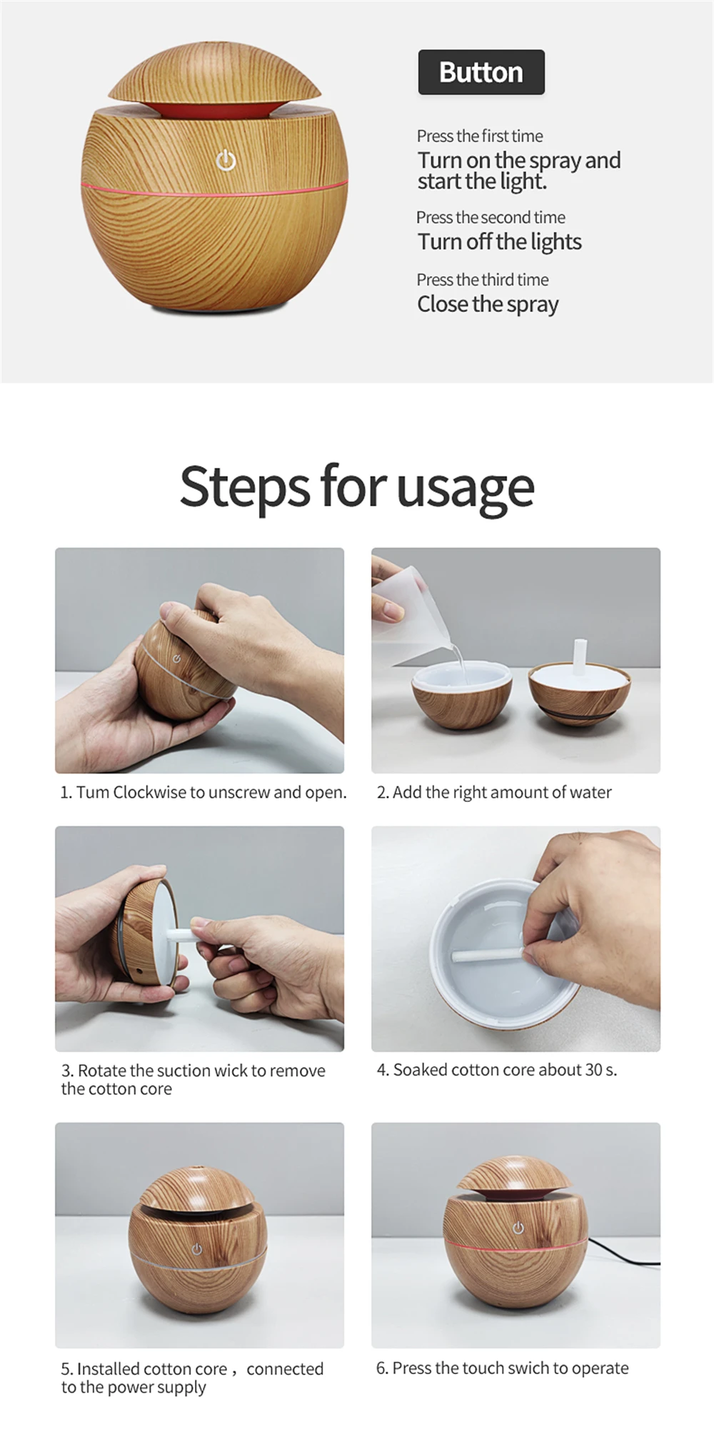 1. Поместите изделие в горизонтальное положение.2. Вращение по часовой стрелке и поднятие крышки увлажнителя, заполните резервуар для воды очищенной водой.3. Добавьте капли ароматерапии/эфирного масла в резервуар для воды.4. Подключите увлажнитель к источнику питания и слегка нажмите кнопку питания. Вторая сенсорная кнопка выключает светодиодный светильник, в третий раз нажмите кнопку выключается.