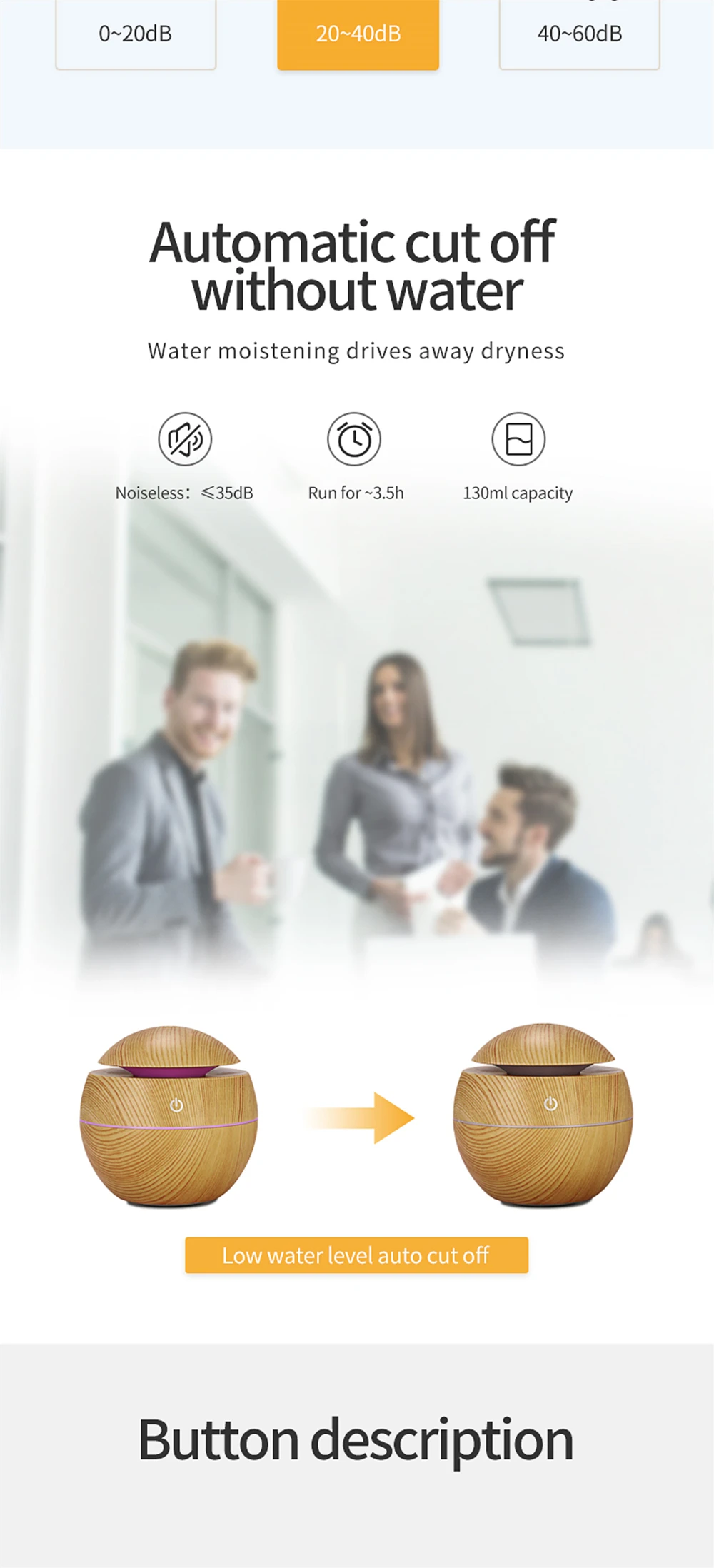 Емкость воды: 130 млВес: 150 гМатериал: АБС + ППРазмер изделия: 3,9 (D)* 3,9 (H)Входное напряжение: AC100-240V 50-60 ГцТип лампы: светодиодныйТуман: 30 мл/чКнопка ВКЛ/ВЫКЛ: цифровое касаниеШум: <35 дБ