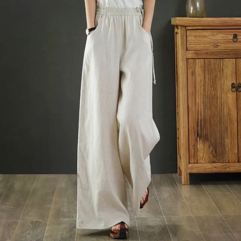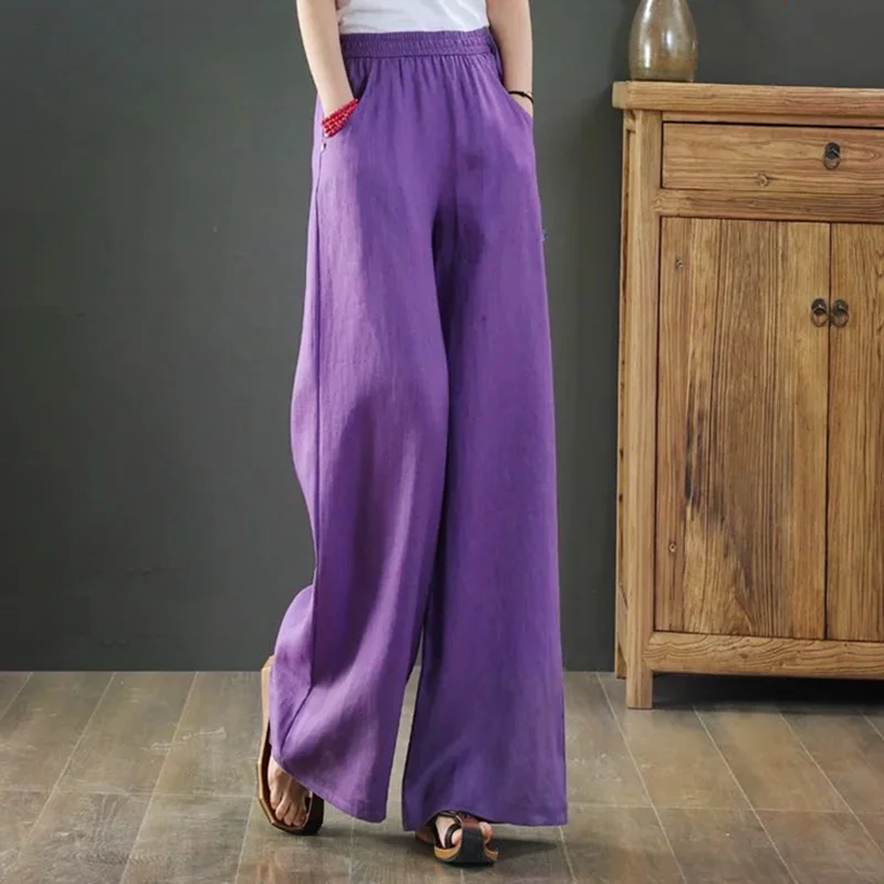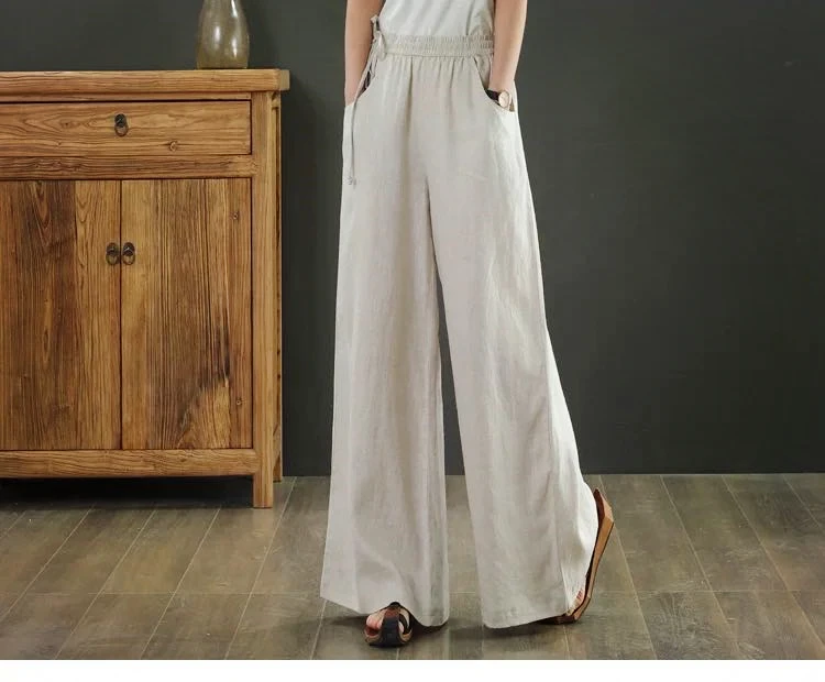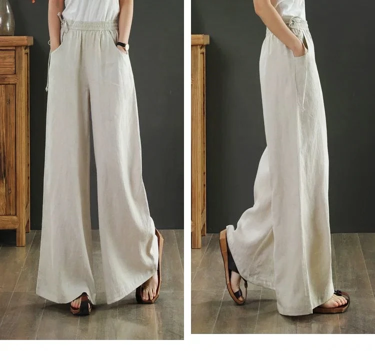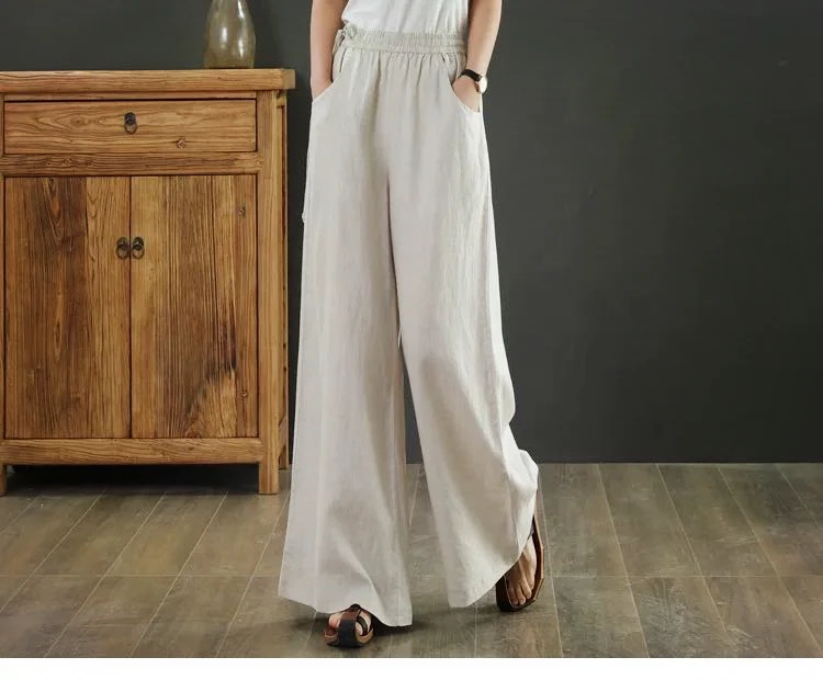 Женские широкие брюки из 100% льна с эластичной резинкой на талии, весна-осень, длина до пола, карманы размера плюс, женская одежда, свободные винтажные брюки
