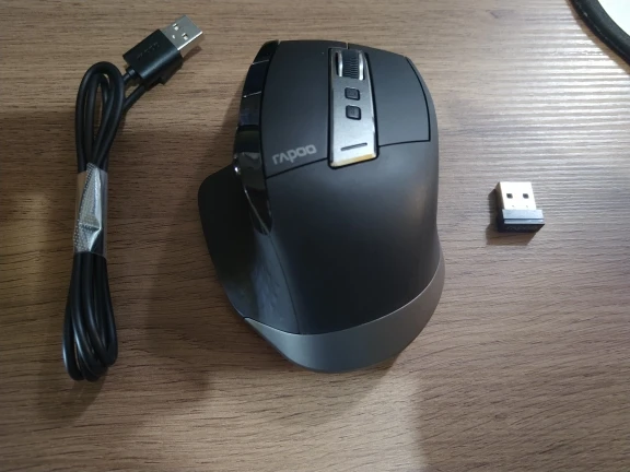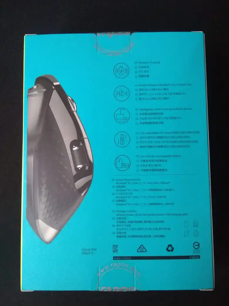 Купил в 11/05/2021, и 26/05/2021 прибыл. Кол-во/мг. Коробка упаковывается в пластиковый пузырь и запечатывается наклейками Rapoo. Plus mouse поставляется с кабелем micro USB для зарядки и беспроводным usb-адаптером для компьютеров с bluetooth.